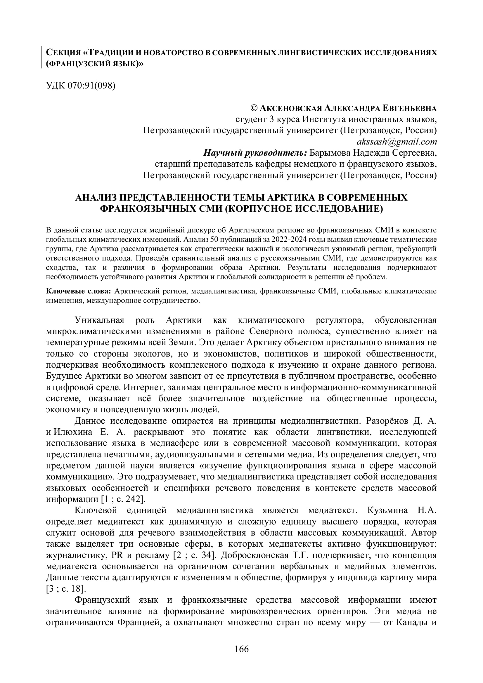 Аксеновская А. Е. Анализ представленности темы Арктика в современных франкоязычных СМИ (корпусное исследование) / А. Е. Аксеновская. — Текст : электронный // Научно-исследовательская работа обучающихся и молодых учёных: материалы 77-й Всероссийской (с международным участием) научной конференции обучающихся и молодых учёных, посвящённой 85-летию ПетрГУ и 80-летию Победы в Великой Отечественной войне (г. Петрозаводск, 31 марта – 27 апреля 2025 года). — Петрозаводск : Изд-во ПетрГУ, 2025. — С. 166-169. — URL: http://elibrary.petrsu.ru/books/79877 (дата обращения: 05.12.2025)