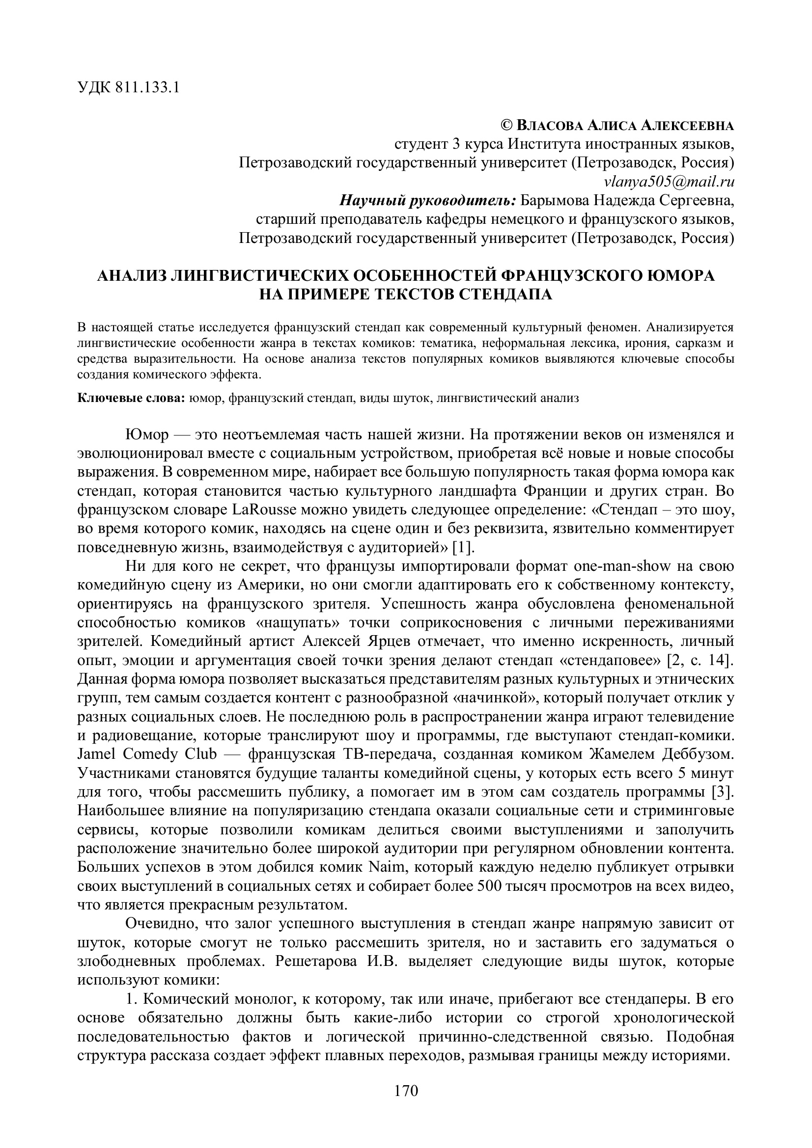 Власова А. А. Анализ лингвистических особенностей французского юмора на примере текстов стендапа / А. А. Власова. — Текст : электронный // Научно-исследовательская работа обучающихся и молодых учёных: материалы 77-й Всероссийской (с международным участием) научной конференции обучающихся и молодых учёных, посвящённой 85-летию ПетрГУ и 80-летию Победы в Великой Отечественной войне (г. Петрозаводск, 31 марта – 27 апреля 2025 года). — Петрозаводск : Изд-во ПетрГУ, 2025. — С. 170-173. — URL: http://elibrary.petrsu.ru/books/79878 (дата обращения: 05.12.2025)