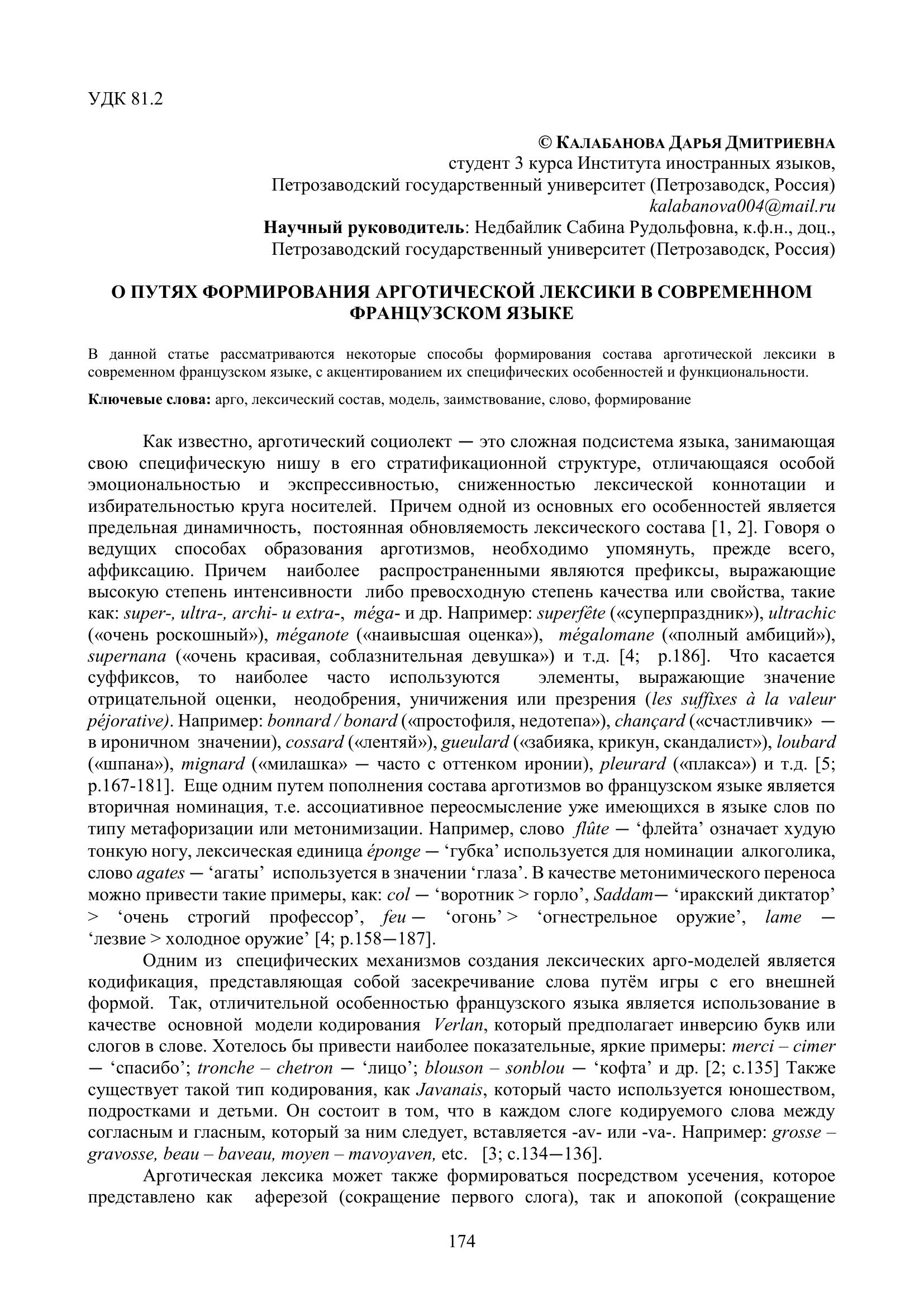 Калабанова Д. Д. О путях формирования арготической лексики в современном французском языке / Д. Д. Калабанова. — Текст : электронный // Научно-исследовательская работа обучающихся и молодых учёных: материалы 77-й Всероссийской (с международным участием) научной конференции обучающихся и молодых учёных, посвящённой 85-летию ПетрГУ и 80-летию Победы в Великой Отечественной войне (г. Петрозаводск, 31 марта – 27 апреля 2025 года). — Петрозаводск : Изд-во ПетрГУ, 2025. — С. 174-176. — URL: http://elibrary.petrsu.ru/books/79880 (дата обращения: 05.12.2025)