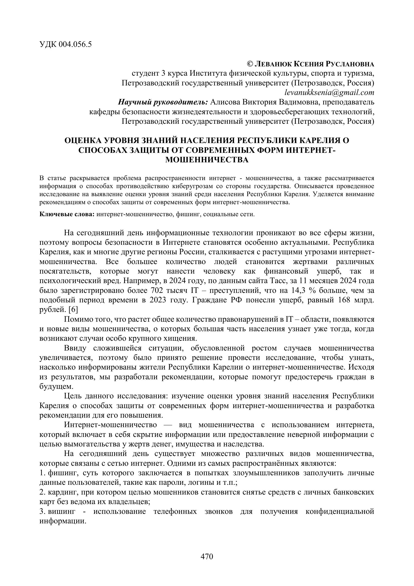 Леванюк К. Р. Оценка уровня знаний населения Республики Карелия о способах защиты от современных форм интернет-мошенничества / К. Р. Леванюк. — Текст : электронный // Научно-исследовательская работа обучающихся и молодых учёных: материалы 77-й Всероссийской (с международным участием) научной конференции обучающихся и молодых учёных, посвящённой 85-летию ПетрГУ и 80-летию Победы в Великой Отечественной войне (г. Петрозаводск, 31 марта – 27 апреля 2025 года). — Петрозаводск : Изд-во ПетрГУ, 2025. — С. 470-473. — URL: http://elibrary.petrsu.ru/books/79884 (дата обращения: 05.12.2025)