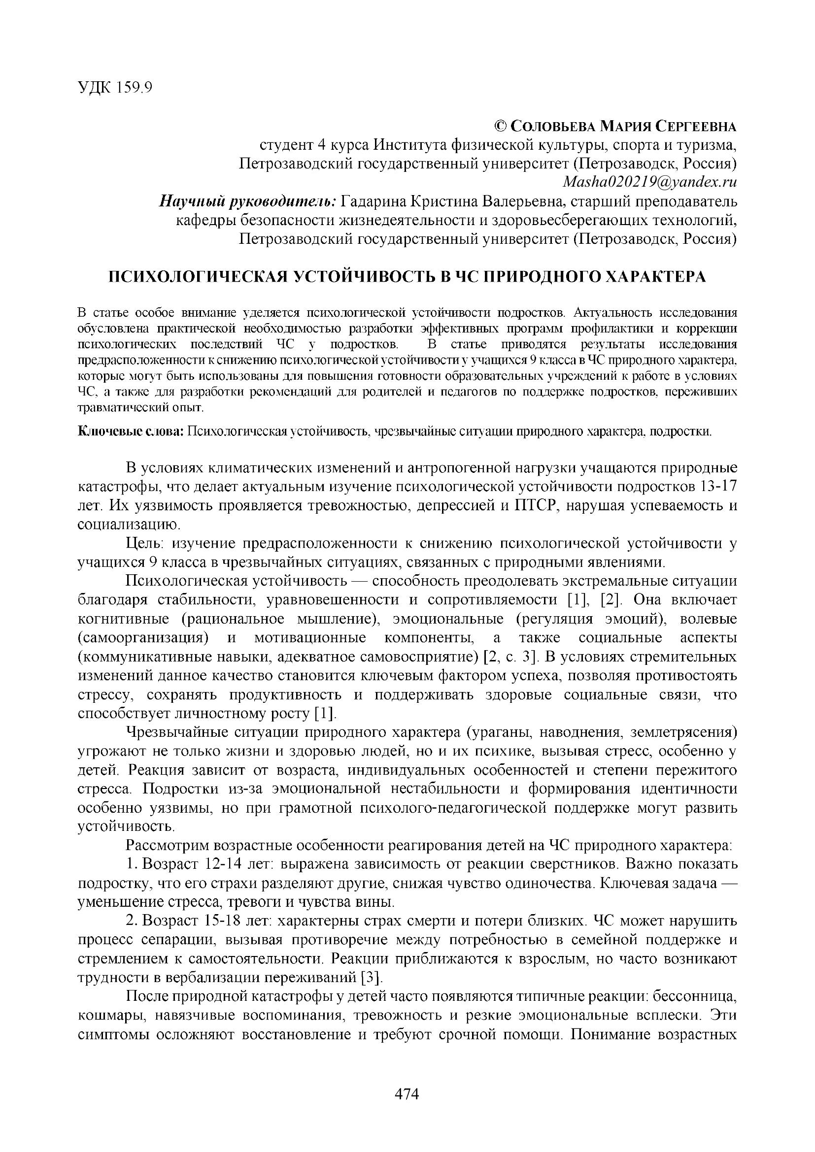 Соловьева М. С. Психологическая устойчивость в ЧС природного характера / М. С. Соловьева. — Текст : электронный // Научно-исследовательская работа обучающихся и молодых учёных: материалы 77-й Всероссийской (с международным участием) научной конференции обучающихся и молодых учёных, посвящённой 85-летию ПетрГУ и 80-летию Победы в Великой Отечественной войне (г. Петрозаводск, 31 марта – 27 апреля 2025 года). — Петрозаводск : Изд-во ПетрГУ, 2025. — С. 474-477. — URL: http://elibrary.petrsu.ru/books/79885 (дата обращения: 05.12.2025)