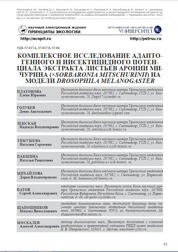 Комплексное исследование адаптогенного и инсектицидного потенциала экстракта листьев аронии Мичурина (×Sorbaronia mitschurinii) на модели Drosophila melanogasterРожкова-Тимина Инна Олеговна, Павлов Максим Викторович, Шепелева Людмила Федоровна