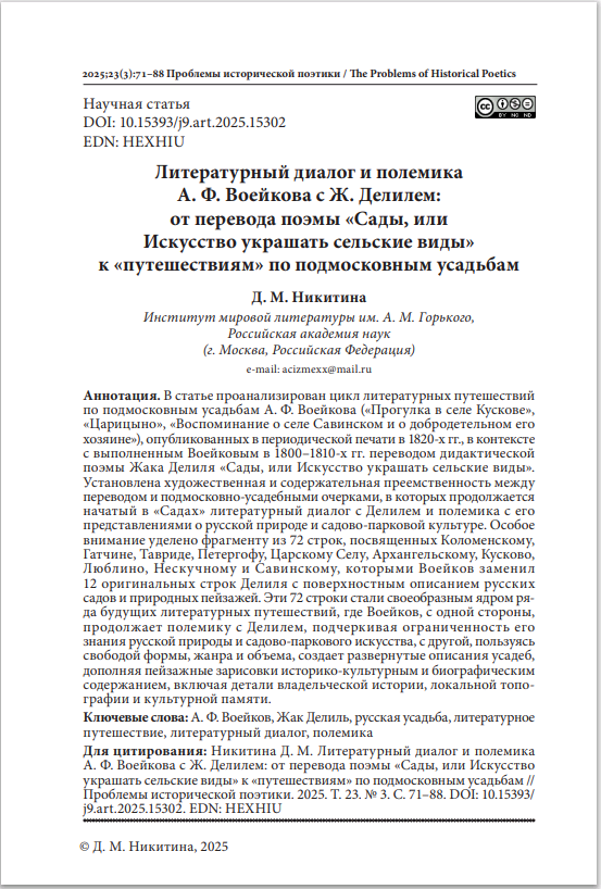 Литературный диалог и полемика А. Ф. Воейкова с Ж. Делилем: от перевода поэмы «Сады, или Искусство украшать сельские виды» к «путешествиям» по подмосковным усадьбамВиноградов Игорь Алексеевич