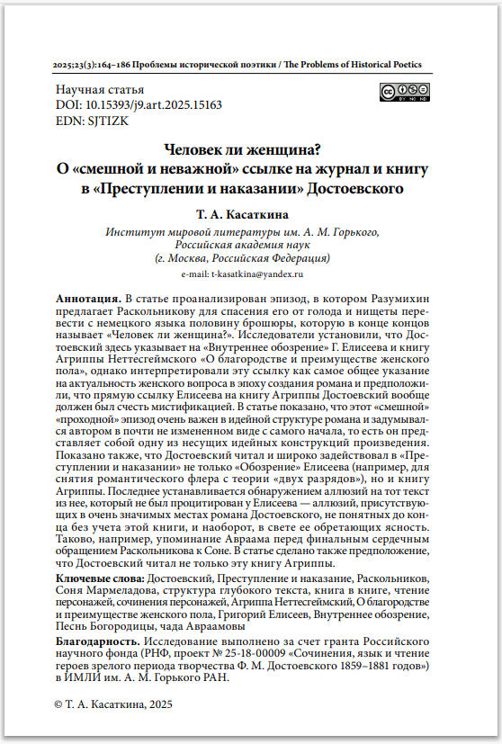 Человек ли женщина? О «смешной и неважной» ссылке на журнал и книгу в «Преступлении и наказании» ДостоевскогоГеронимус Евгения Михайловна