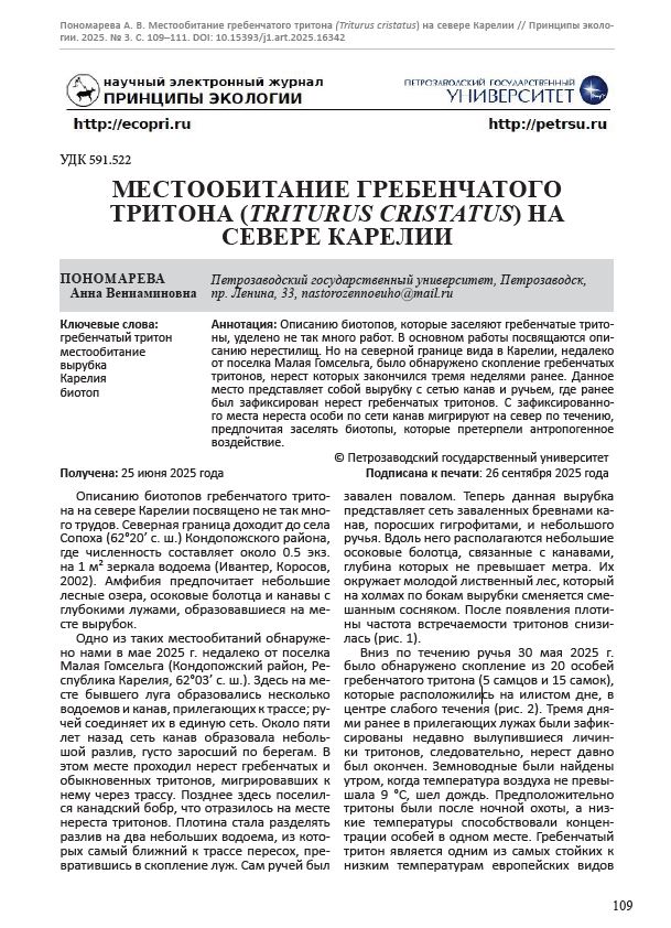 Местообитание гребенчатого тритона (Triturus cristatus) на севере КарелииТкачев Александр Николаевич