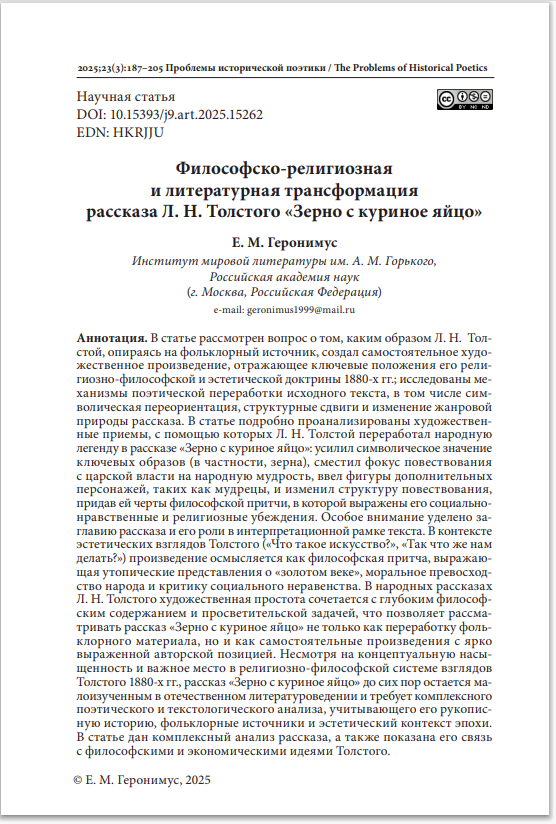 Философско-религиозная и литературная трансформация рассказа Л. Н. Толстого «Зерно с куриное яйцо»Есаулов Иван Андреевич