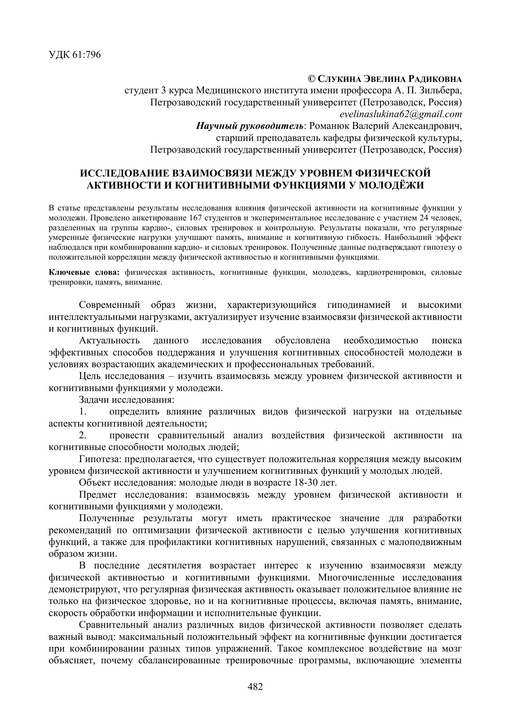 Слукина Э. Р. Исследование взаимосвязи между уровнем физической активности и когнитивными функциями у молодежи / Э. Р. Слукина. — Текст : электронный // Научно-исследовательская работа обучающихся и молодых учёных: материалы 77-й Всероссийской (с международным участием) научной конференции обучающихся и молодых учёных, посвящённой 85-летию ПетрГУ и 80-летию Победы в Великой Отечественной войне (г. Петрозаводск, 31 марта – 27 апреля 2025 года). — Петрозаводск : Изд-во ПетрГУ, 2025. — С. 482-485. — URL: http://elibrary.petrsu.ru/books/79990 (дата обращения: 05.12.2025)