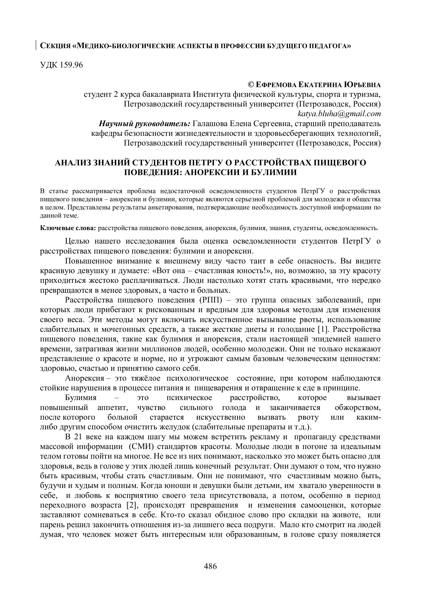 В статье рассматривается проблема недостаточной осведомленности студентов ПетрГУ о расстройствах пищевого поведения – анорексии и булимии, которые являются серьезной проблемой для молодежи и общества в целом. Представлены результаты анкетирования, подтверждающие необходимость доступной информации по данной теме.