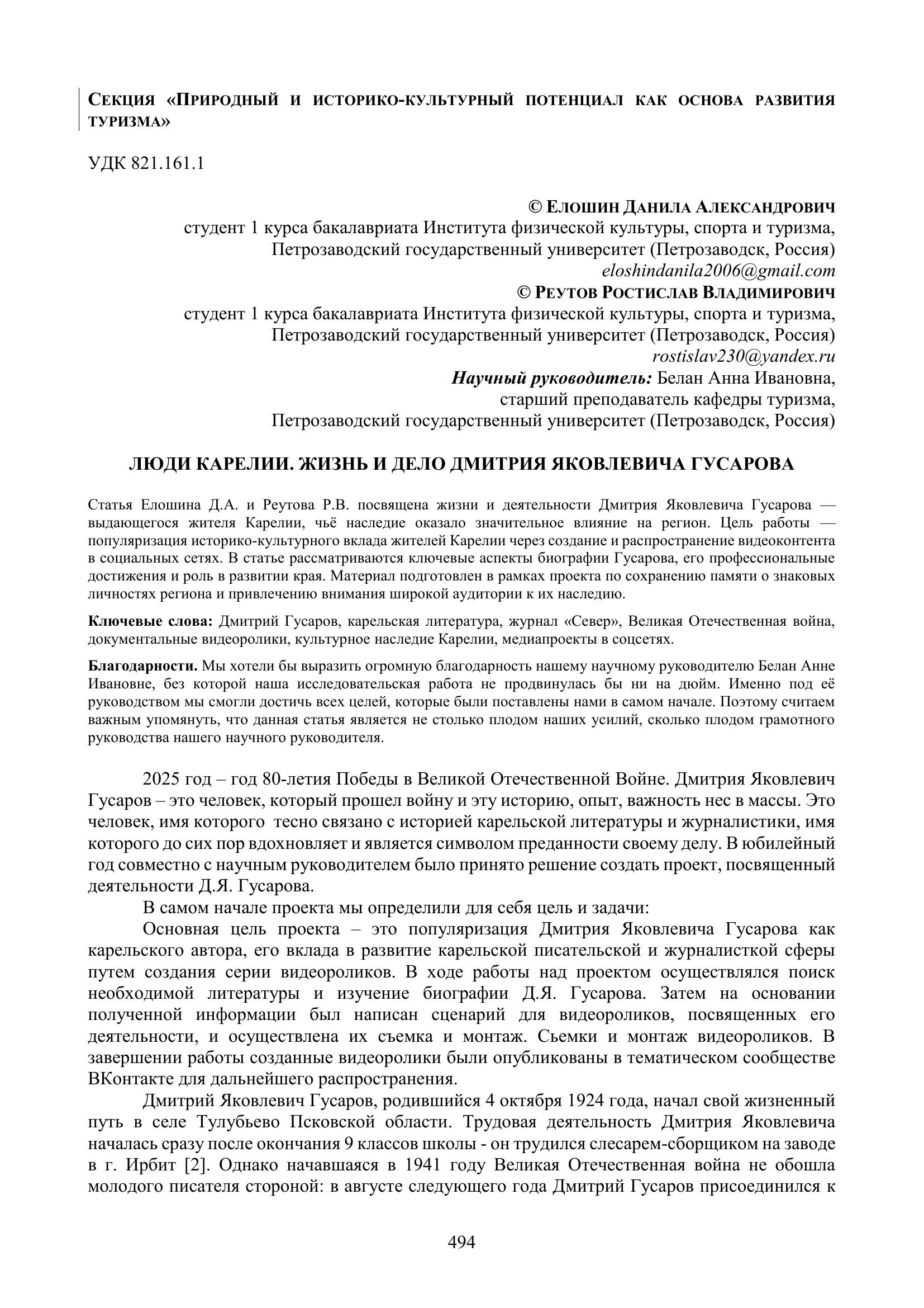 Статья Елошина Д. А. и Реутова Р. В. посвящена жизни и деятельности Дмитрия Яковлевича Гусарова – выдающегося жителя Карелии, чье наследие оказало значительное влияние на регион. Цель работы – популяризация историко-культурного вклада жителей Карелии через создание и распространение видеоконтента в социальных сетях. В статье рассматриваются ключевые аспекты биографии Гусарова, его профессиональные достижения и роль в развитии края. Материал подготовлен в рамках проекта по сохранению памяти о знаковых личностях региона и привлечению внимания широкой аудитории к их наследию.