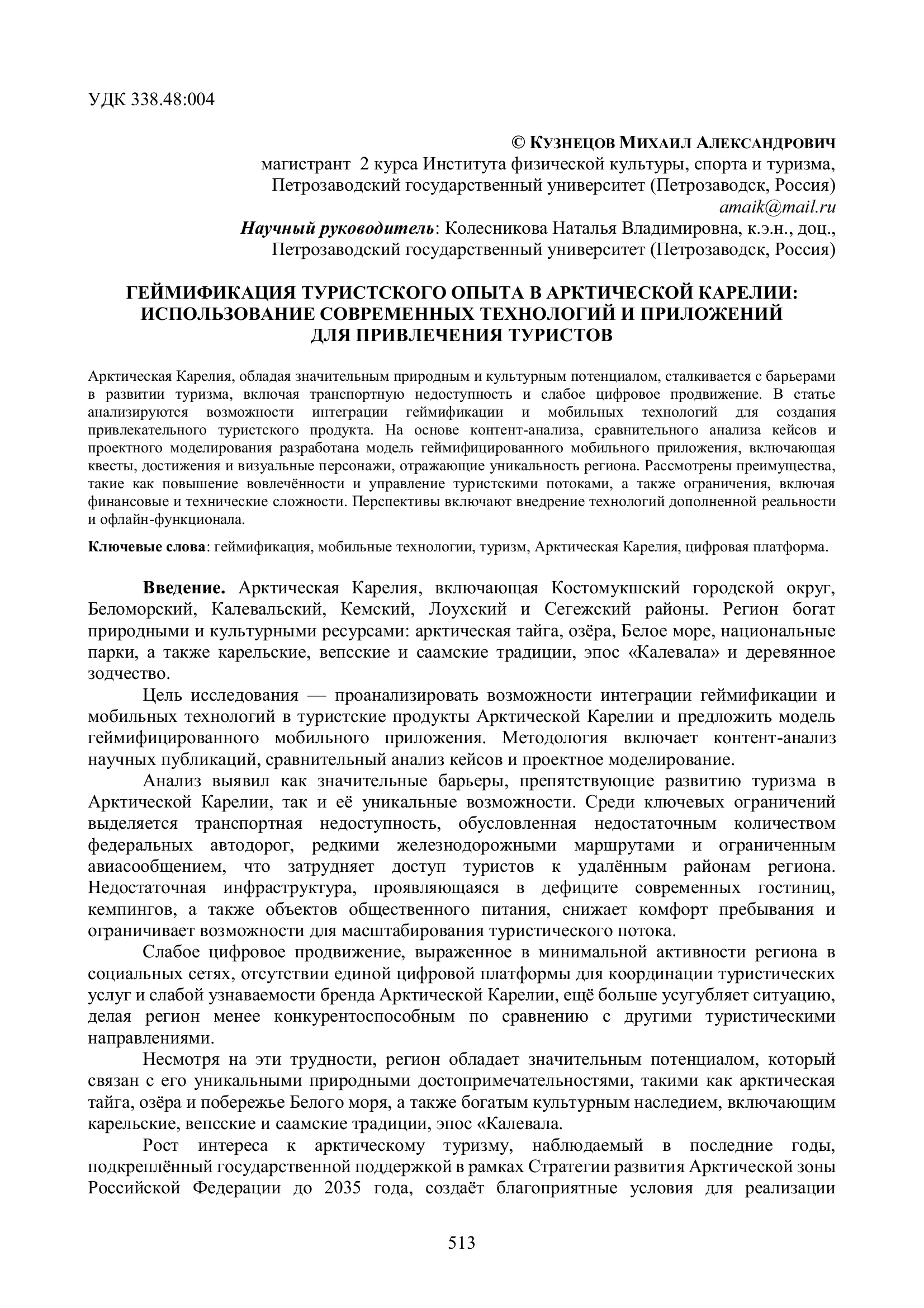 Кузнецов М. А. Геймификация туристского опыта в Арктической Карелии: использование современных технологий и приложений для привлечения туристов / М. А. Кузнецов. — Текст : электронный // Научно-исследовательская работа обучающихся и молодых учёных: материалы 77-й Всероссийской (с международным участием) научной конференции обучающихся и молодых учёных, посвящённой 85-летию ПетрГУ и 80-летию Победы в Великой Отечественной войне (г. Петрозаводск, 31 марта – 27 апреля 2025 года). — Петрозаводск : Изд-во ПетрГУ, 2025. — С. 513-516. — URL: http://elibrary.petrsu.ru/books/80026 (дата обращения: 05.12.2025)