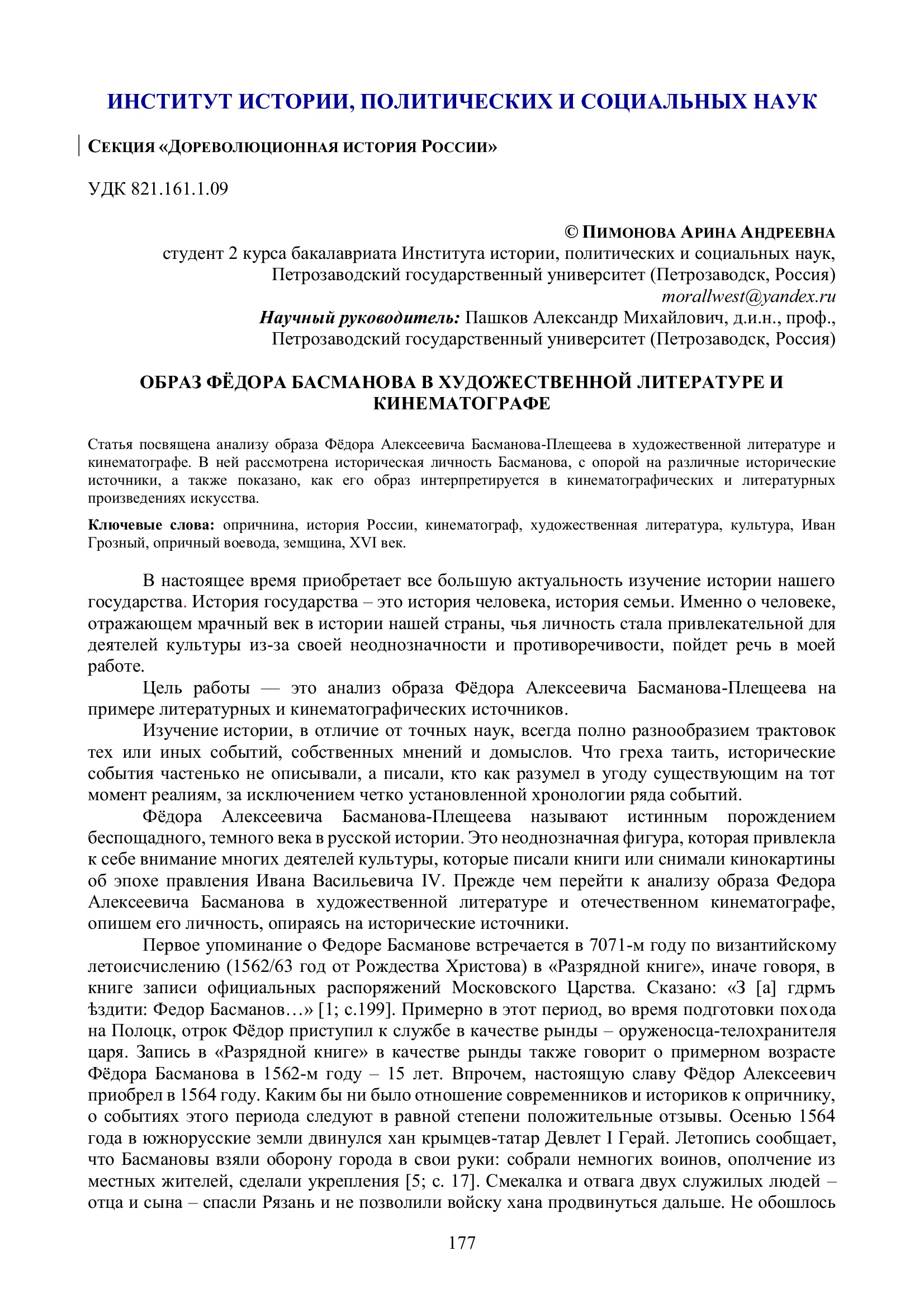 Пимонова А. А. Образ Федора Басманова в художественной литературе и кинематографе / А. А. Пимонова. — Текст : электронный // Научно-исследовательская работа обучающихся и молодых учёных: материалы 77-й Всероссийской (с международным участием) научной конференции обучающихся и молодых учёных, посвящённой 85-летию ПетрГУ и 80-летию Победы в Великой Отечественной войне (г. Петрозаводск, 31 марта – 27 апреля 2025 года). — Петрозаводск : Изд-во ПетрГУ, 2025. — С. 177-179. — URL: http://elibrary.petrsu.ru/books/80027 (дата обращения: 05.12.2025)