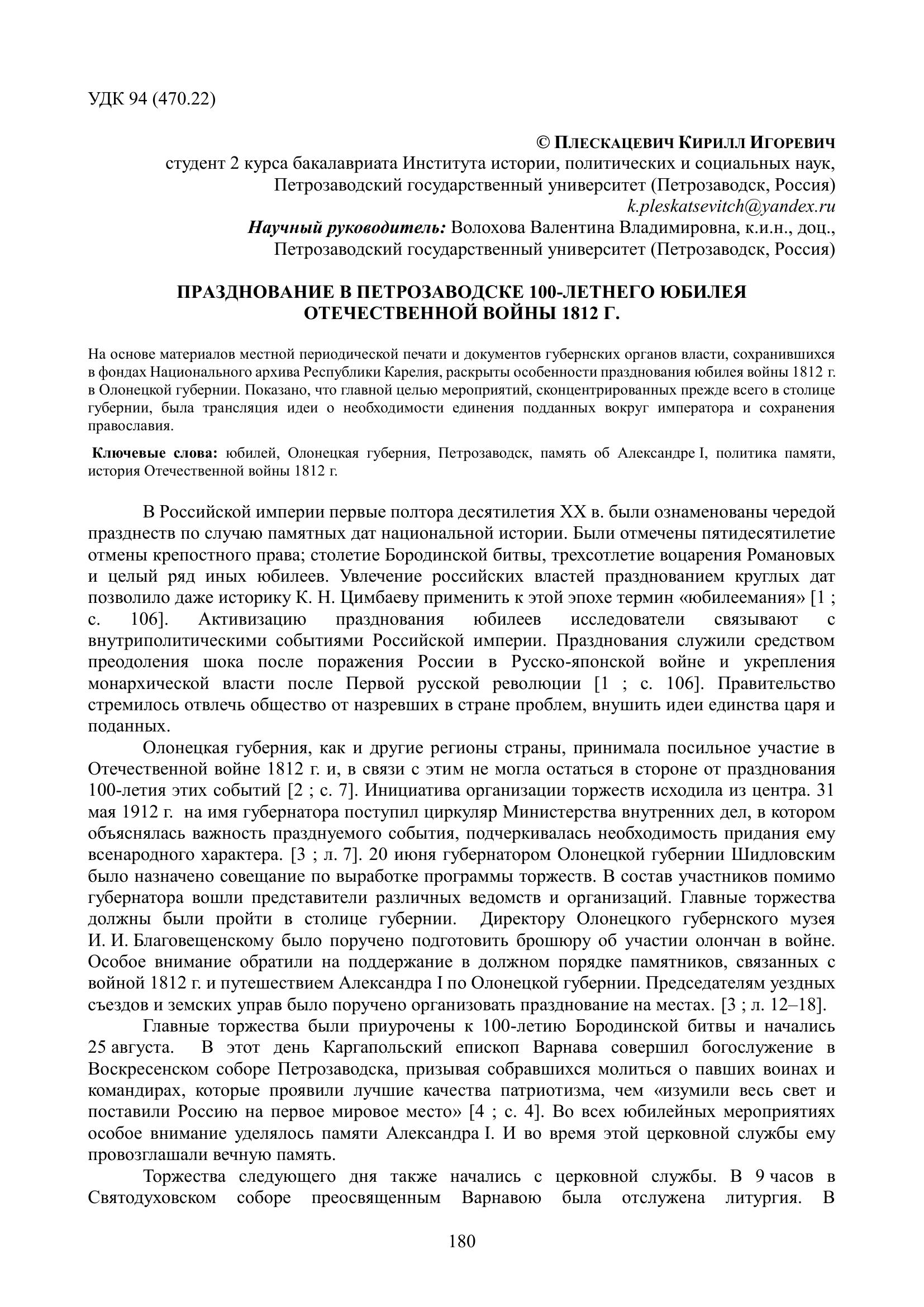 Плескацевич К. И. Празднование в Петрозаводске 100-летнего юбилея Отечественной войны 1812 г. / К. И. Плескацевич. — Текст : электронный // Научно-исследовательская работа обучающихся и молодых учёных: материалы 77-й Всероссийской (с международным участием) научной конференции обучающихся и молодых учёных, посвящённой 85-летию ПетрГУ и 80-летию Победы в Великой Отечественной войне (г. Петрозаводск, 31 марта – 27 апреля 2025 года). — Петрозаводск : Изд-во ПетрГУ, 2025. — С. 180-182. — URL: http://elibrary.petrsu.ru/books/80029 (дата обращения: 05.12.2025)