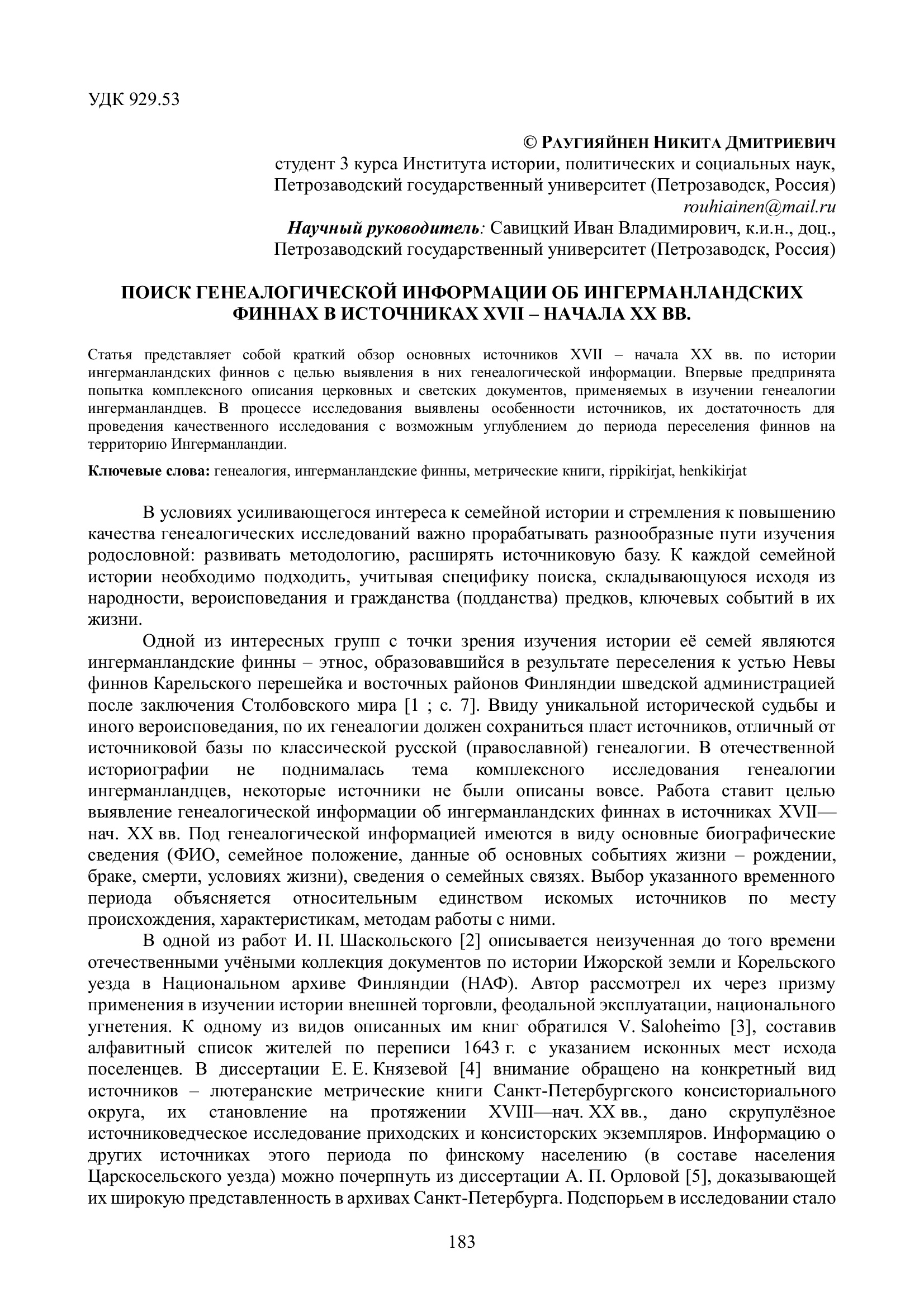 Раутияйнен Н. Д. Поиск генеалогической информации об ингерманландских финнах в источниках XVII – начала XX вв. / Н. Д. Раутияйнен. — Текст : электронный // Научно-исследовательская работа обучающихся и молодых учёных: материалы 77-й Всероссийской (с международным участием) научной конференции обучающихся и молодых учёных, посвящённой 85-летию ПетрГУ и 80-летию Победы в Великой Отечественной войне (г. Петрозаводск, 31 марта – 27 апреля 2025 года). — Петрозаводск : Изд-во ПетрГУ, 2025. — С. 183-186. — URL: http://elibrary.petrsu.ru/books/80030 (дата обращения: 05.12.2025)