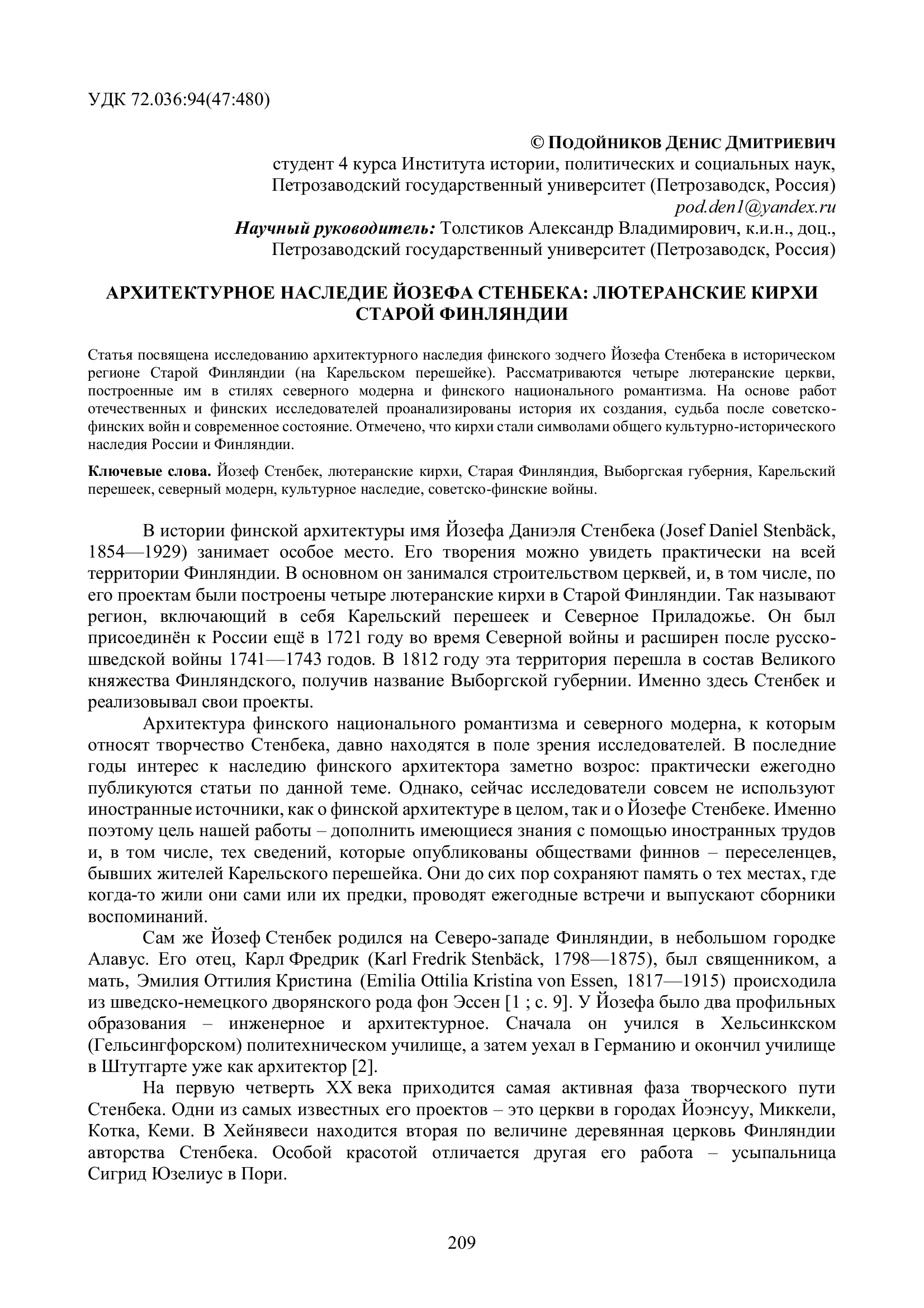 Подойников Д. Д. Архитектурное наследие Йозефа Стенбека: лютеранские кирхи Старой Финляндии / Д. Д. Подойников. — Текст : электронный // Научно-исследовательская работа обучающихся и молодых учёных: материалы 77-й Всероссийской (с международным участием) научной конференции обучающихся и молодых учёных, посвящённой 85-летию ПетрГУ и 80-летию Победы в Великой Отечественной войне (г. Петрозаводск, 31 марта – 27 апреля 2025 года). — Петрозаводск : Изд-во ПетрГУ, 2025. — С. 209-211. — URL: http://elibrary.petrsu.ru/books/80037 (дата обращения: 05.12.2025)
