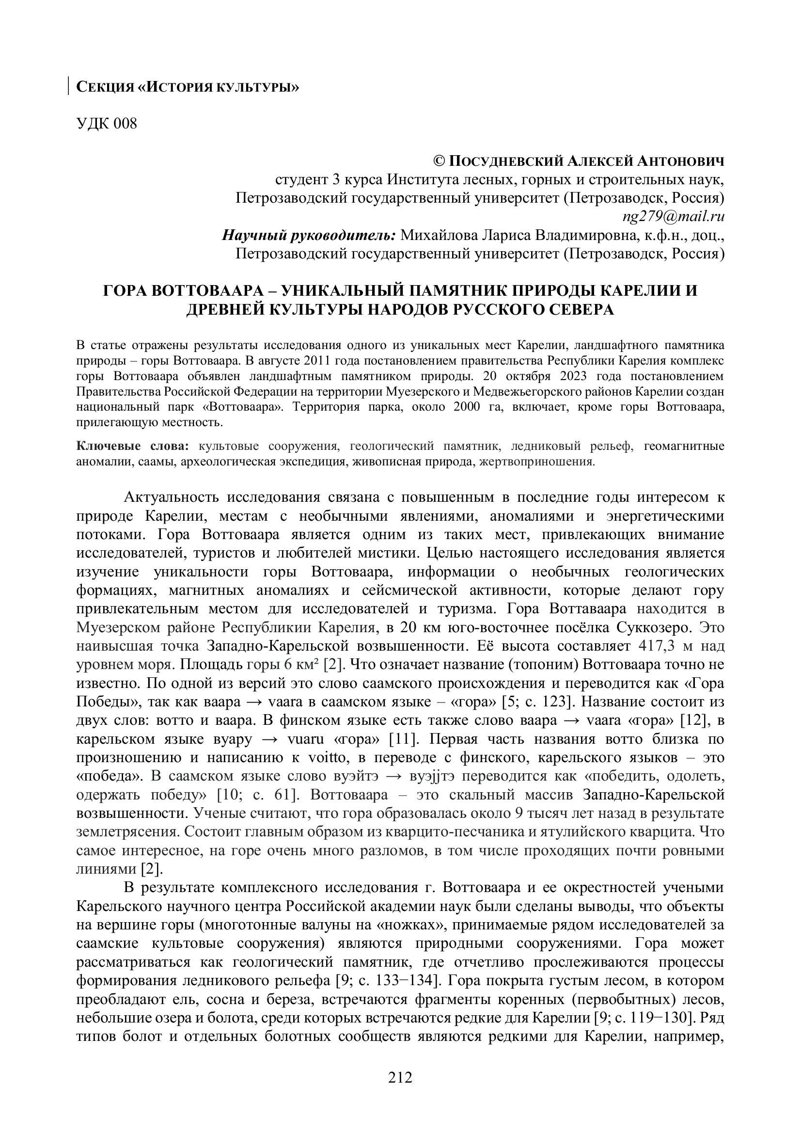 Посудиевский А. А. Гора Воттоваара – уникальный памятник природы Карелии и древней культуры народов Русского Севера / А. А. Посудиевский. — Текст : электронный // Научно-исследовательская работа обучающихся и молодых учёных: материалы 77-й Всероссийской (с международным участием) научной конференции обучающихся и молодых учёных, посвящённой 85-летию ПетрГУ и 80-летию Победы в Великой Отечественной войне (г. Петрозаводск, 31 марта – 27 апреля 2025 года). — Петрозаводск : Изд-во ПетрГУ, 2025. — С. 212-214. — URL: http://elibrary.petrsu.ru/books/80044 (дата обращения: 05.12.2025)