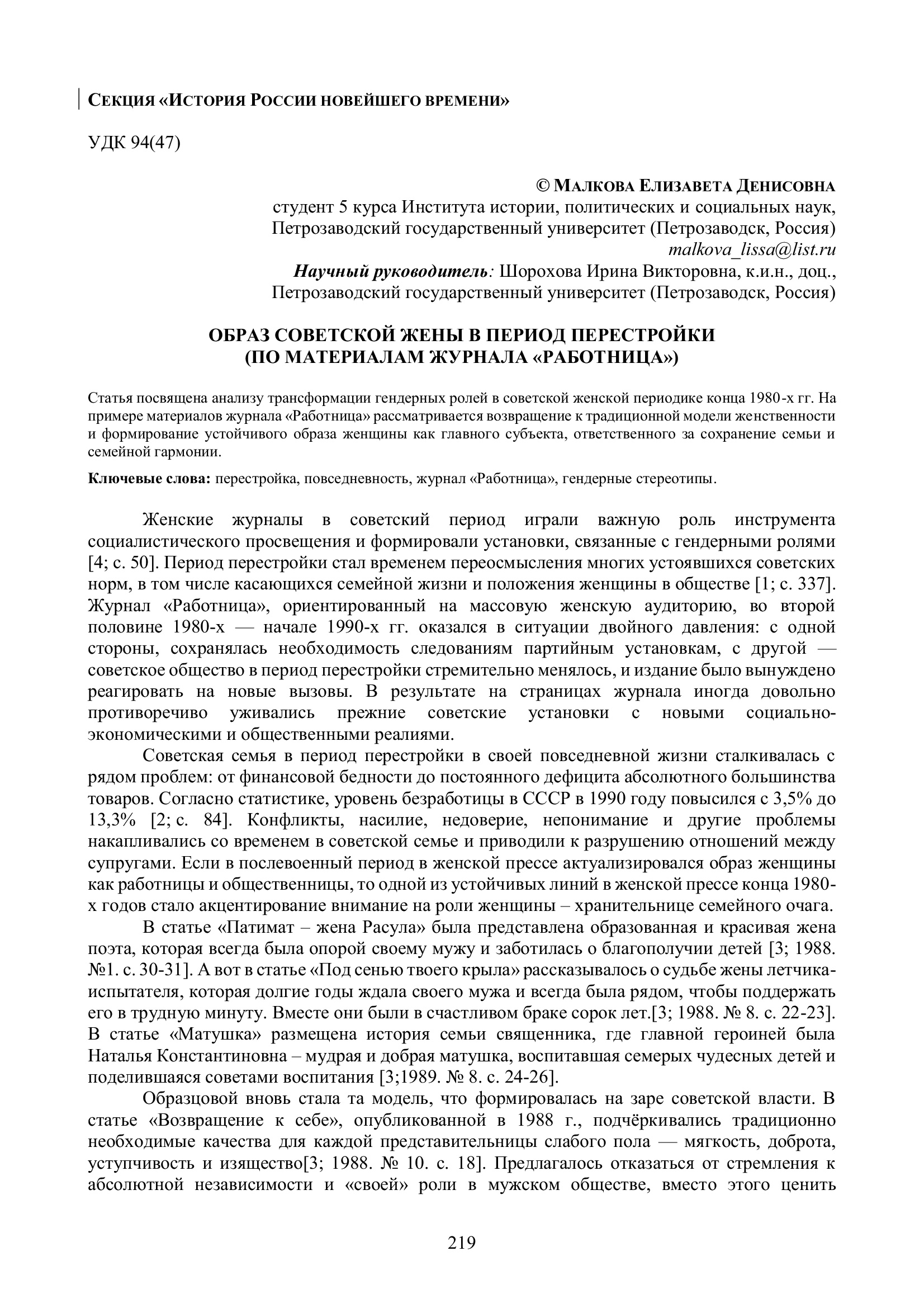 Малкова Е. Д. Образ советской жены в период перестройки (по материалам журнала «Работница») / Е. Д. Малкова. — Текст : электронный // Научно-исследовательская работа обучающихся и молодых учёных: материалы 77-й Всероссийской (с международным участием) научной конференции обучающихся и молодых учёных, посвящённой 85-летию ПетрГУ и 80-летию Победы в Великой Отечественной войне (г. Петрозаводск, 31 марта – 27 апреля 2025 года). — Петрозаводск : Изд-во ПетрГУ, 2025. — С. 219-221. — URL: http://elibrary.petrsu.ru/books/80084 (дата обращения: 05.12.2025)