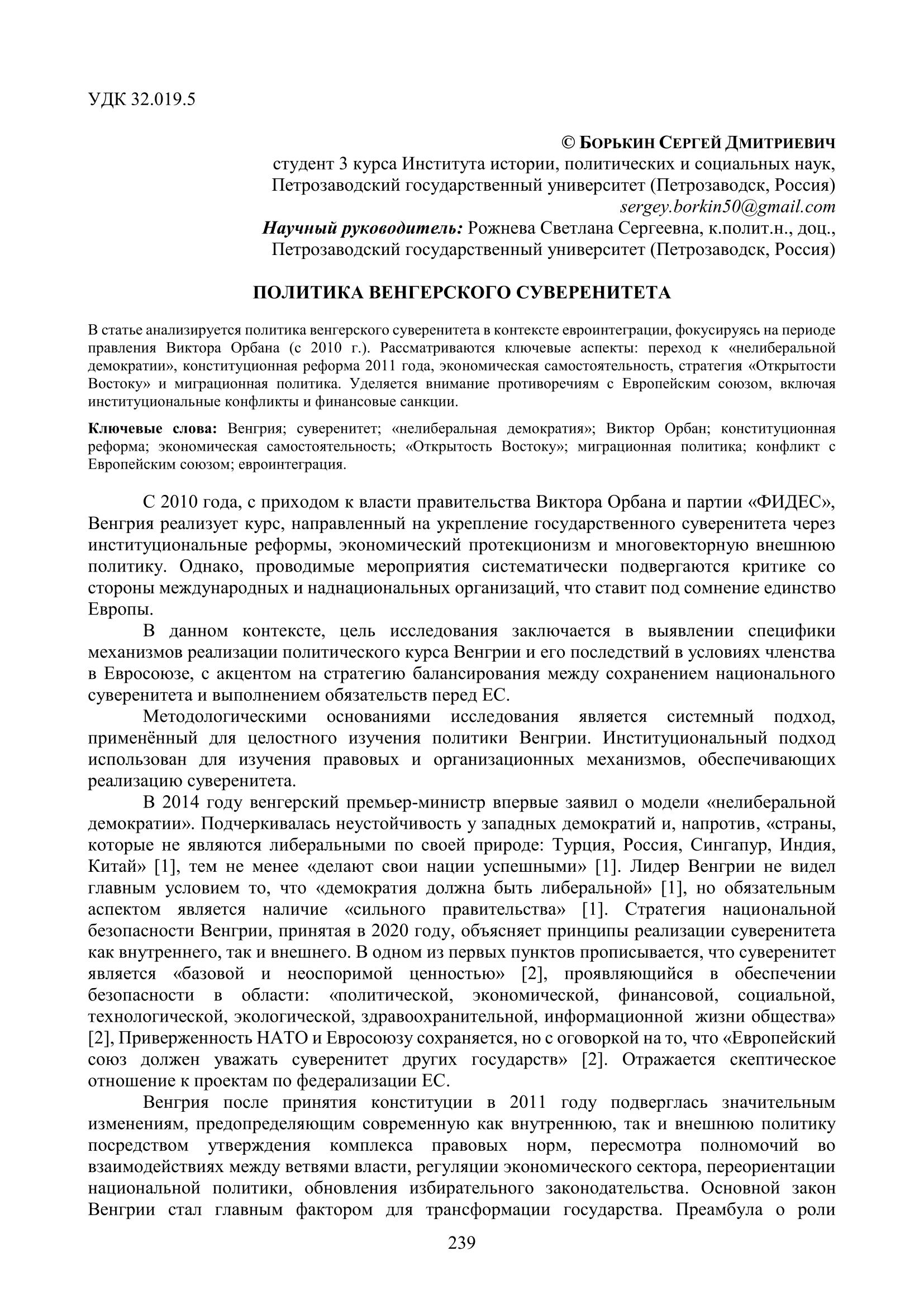 Борькин С. Д. Политика венгерского суверенитета / С. Д. Борькин. — Текст : электронный // Научно-исследовательская работа обучающихся и молодых учёных: материалы 77-й Всероссийской (с международным участием) научной конференции обучающихся и молодых учёных, посвящённой 85-летию ПетрГУ и 80-летию Победы в Великой Отечественной войне (г. Петрозаводск, 31 марта – 27 апреля 2025 года). — Петрозаводск : Изд-во ПетрГУ, 2025. — С. 239-241. — URL: http://elibrary.petrsu.ru/books/80090 (дата обращения: 05.12.2025)