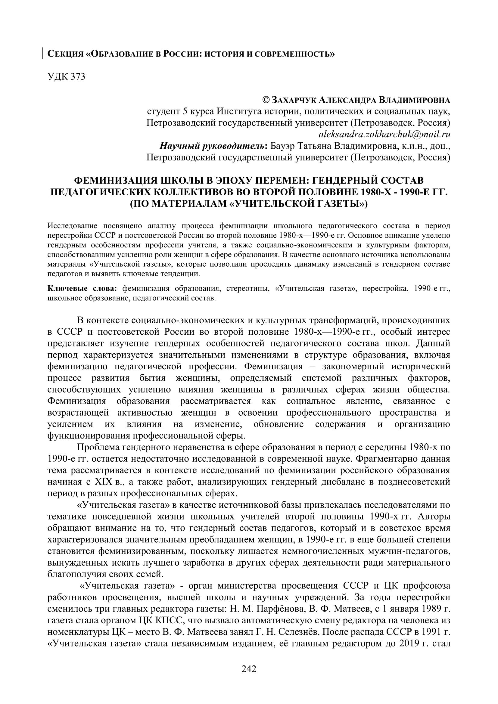 Захарчук А. В. Феминизация школы в эпоху перемен: гендерный состав педагогических коллективов во второй половине 1980-х - 1990-е гг. (по материалам «Учительской газеты») / А. В. Захарчук. — Текст : электронный // Научно-исследовательская работа обучающихся и молодых учёных: материалы 77-й Всероссийской (с международным участием) научной конференции обучающихся и молодых учёных, посвящённой 85-летию ПетрГУ и 80-летию Победы в Великой Отечественной войне (г. Петрозаводск, 31 марта – 27 апреля 2025 года). — Петрозаводск : Изд-во ПетрГУ, 2025. — С. 242-244. — URL: http://elibrary.petrsu.ru/books/80091 (дата обращения: 05.12.2025)