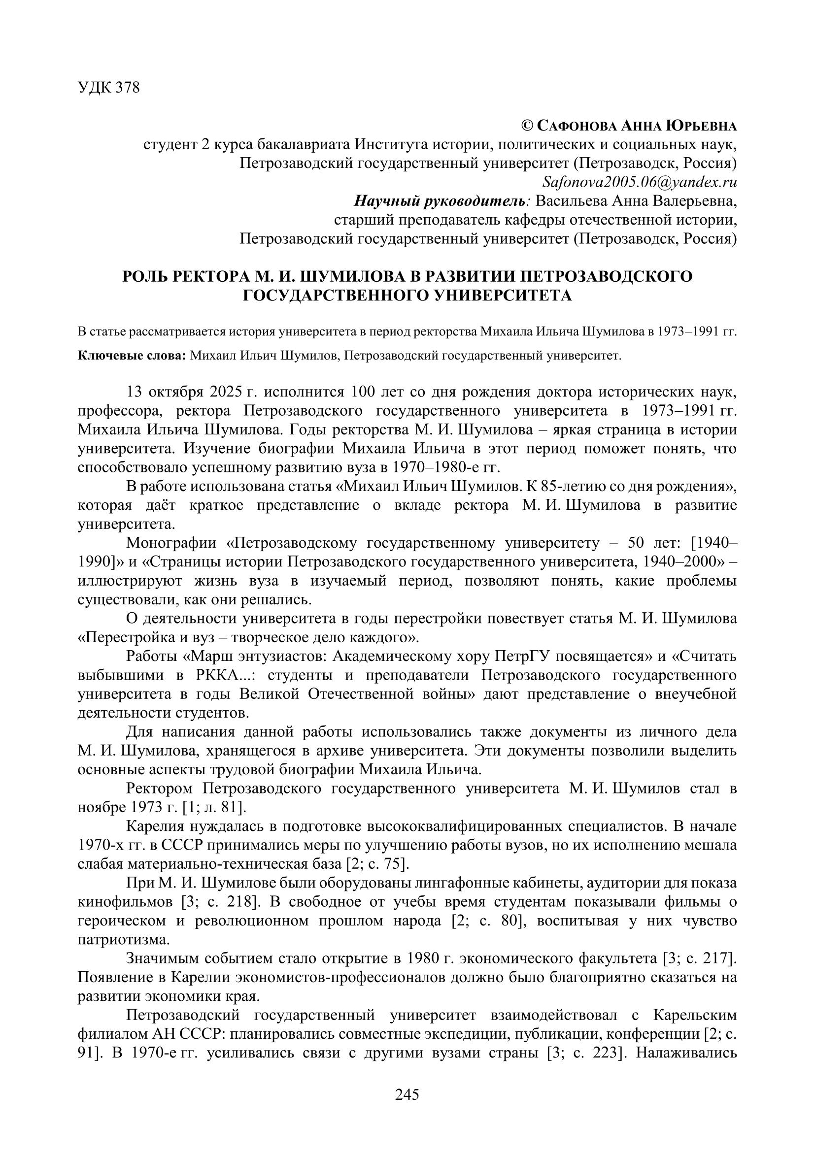 Сафонова А. Ю. Роль ректора М. И. Шумилова в развитии Петрозаводского государственного университета / А. Ю. Сафонова. — Текст : электронный // Научно-исследовательская работа обучающихся и молодых учёных: материалы 77-й Всероссийской (с международным участием) научной конференции обучающихся и молодых учёных, посвящённой 85-летию ПетрГУ и 80-летию Победы в Великой Отечественной войне (г. Петрозаводск, 31 марта – 27 апреля 2025 года). — Петрозаводск : Изд-во ПетрГУ, 2025. — С. 245-247. — URL: http://elibrary.petrsu.ru/books/80092 (дата обращения: 05.12.2025)