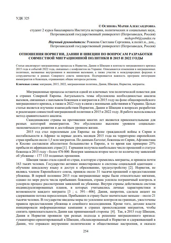 Осипова М. А. Отношения Норвегии, Дании и Швеции по вопросам разработки совместной миграционной политики в 2015 и 2022 годы / М. А. Осипова. — Текст : электронный // Научно-исследовательская работа обучающихся и молодых учёных: материалы 77-й Всероссийской (с международным участием) научной конференции обучающихся и молодых учёных, посвящённой 85-летию ПетрГУ и 80-летию Победы в Великой Отечественной войне (г. Петрозаводск, 31 марта – 27 апреля 2025 года). — Петрозаводск : Изд-во ПетрГУ, 2025. — С. 254-256. — URL: http://elibrary.petrsu.ru/books/80095 (дата обращения: 05.12.2025)