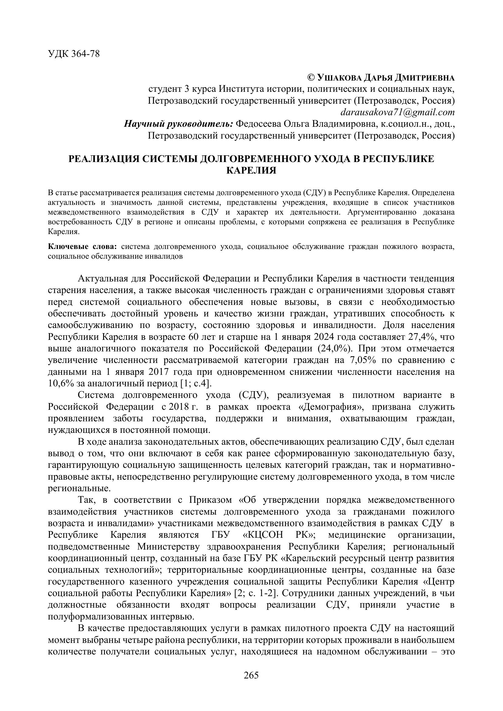 Ушакова Д. Д. Реализация системы долговременного ухода в Республике Карелия / Д. Д. Ушакова. — Текст : электронный // Научно-исследовательская работа обучающихся и молодых учёных: материалы 77-й Всероссийской (с международным участием) научной конференции обучающихся и молодых учёных, посвящённой 85-летию ПетрГУ и 80-летию Победы в Великой Отечественной войне (г. Петрозаводск, 31 марта – 27 апреля 2025 года). — Петрозаводск : Изд-во ПетрГУ, 2025. — С. 265-267. — URL: http://elibrary.petrsu.ru/books/80098 (дата обращения: 05.12.2025)