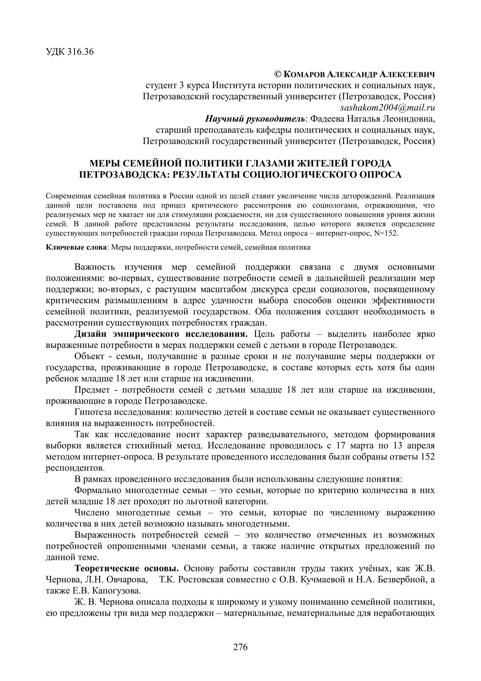 Комаров А. А. Меры семейной политики глазами жителей города Петрозаводска: результаты социологического опроса / А. А. Комаров. — Текст : электронный // Научно-исследовательская работа обучающихся и молодых учёных: материалы 77-й Всероссийской (с международным участием) научной конференции обучающихся и молодых учёных, посвящённой 85-летию ПетрГУ и 80-летию Победы в Великой Отечественной войне (г. Петрозаводск, 31 марта – 27 апреля 2025 года). — Петрозаводск : Изд-во ПетрГУ, 2025. — С. 276-279. — URL: http://elibrary.petrsu.ru/books/80102 (дата обращения: 05.12.2025)