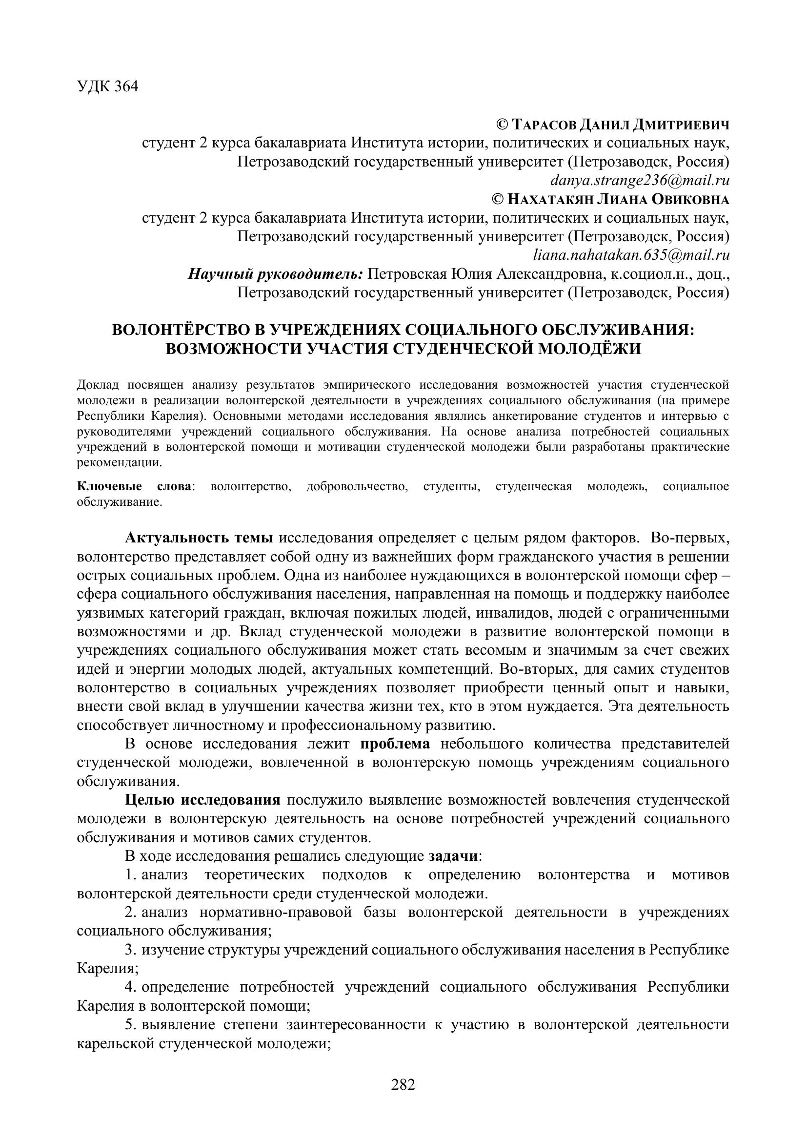 Тарасов Д. Д. Волонтерство в учреждениях социального обслуживания: возможности участия студенческой молодёжи / Д. Д. Тарасов, Л. О. Нахатакян. — Текст : электронный // Научно-исследовательская работа обучающихся и молодых учёных: материалы 77-й Всероссийской (с международным участием) научной конференции обучающихся и молодых учёных, посвящённой 85-летию ПетрГУ и 80-летию Победы в Великой Отечественной войне (г. Петрозаводск, 31 марта – 27 апреля 2025 года). — Петрозаводск : Изд-во ПетрГУ, 2025. — С. 282-284. — URL: http://elibrary.petrsu.ru/books/80104 (дата обращения: 05.12.2025)