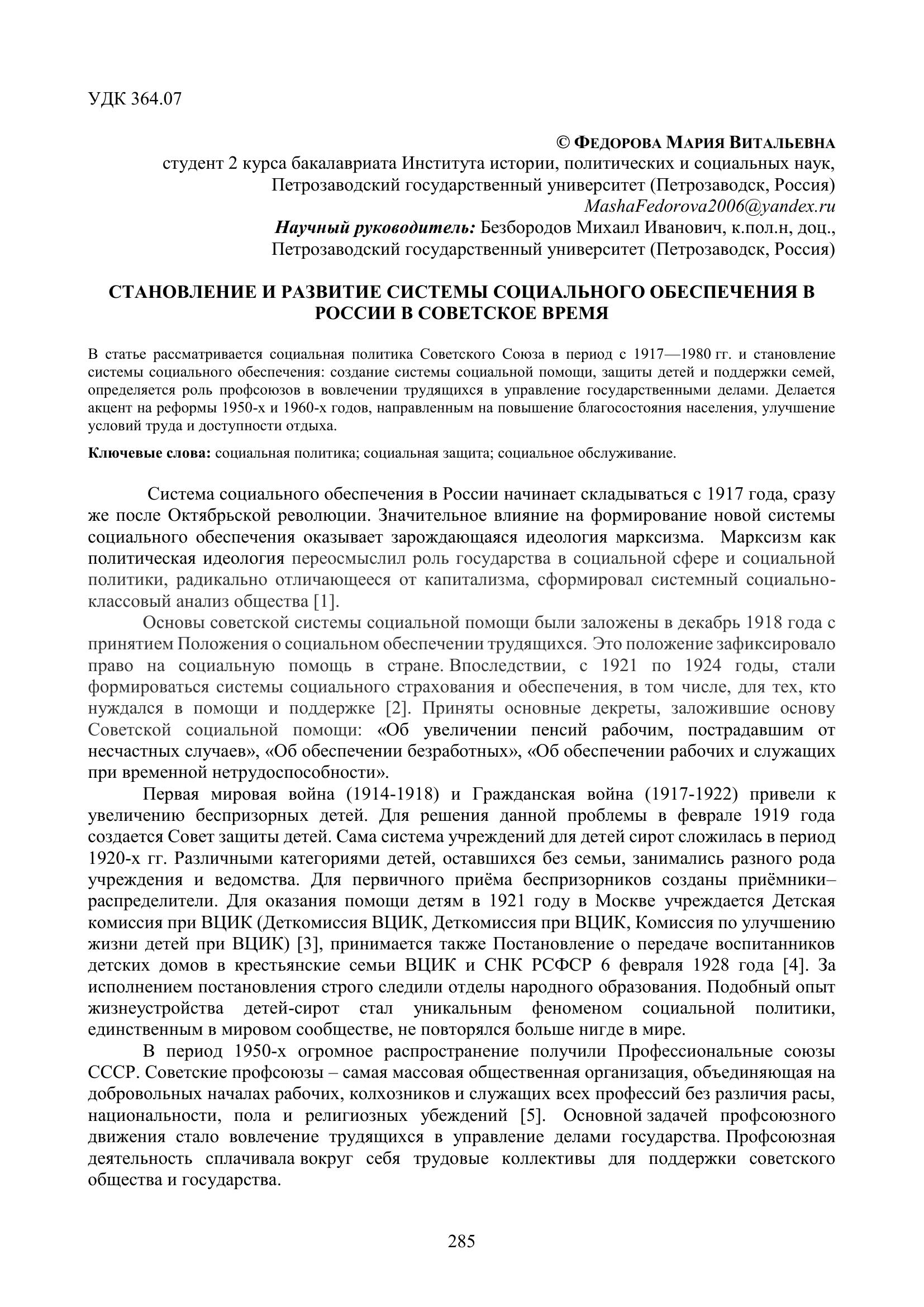 Федорова М. В. Становление и развитие системы социального обеспечения в России в советское время / М. В. Федорова. — Текст : электронный // Научно-исследовательская работа обучающихся и молодых учёных: материалы 77-й Всероссийской (с международным участием) научной конференции обучающихся и молодых учёных, посвящённой 85-летию ПетрГУ и 80-летию Победы в Великой Отечественной войне (г. Петрозаводск, 31 марта – 27 апреля 2025 года). — Петрозаводск : Изд-во ПетрГУ, 2025. — С. 285-287. — URL: http://elibrary.petrsu.ru/books/80105 (дата обращения: 05.12.2025)