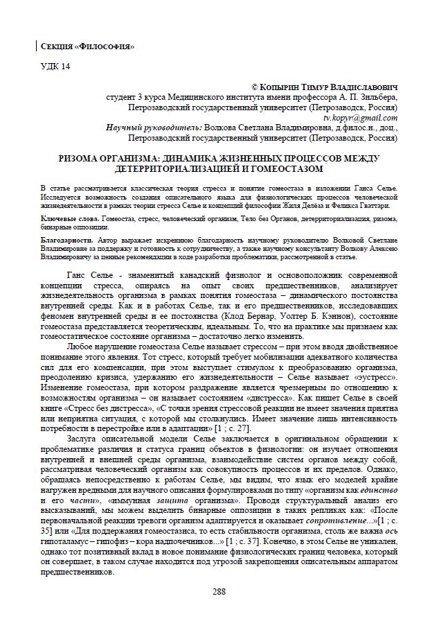Копырин Т. В. Ризома организма: динамика жизненных процессов между детерриториализацией и гомеостазом / Т. В. Копырин. — Текст : электронный // Научно-исследовательская работа обучающихся и молодых учёных: материалы 77-й Всероссийской (с международным участием) научной конференции обучающихся и молодых учёных, посвящённой 85-летию ПетрГУ и 80-летию Победы в Великой Отечественной войне (г. Петрозаводск, 31 марта – 27 апреля 2025 года). — Петрозаводск : Изд-во ПетрГУ, 2025. — С. 288-291. — URL: http://elibrary.petrsu.ru/books/80106 (дата обращения: 05.12.2025)