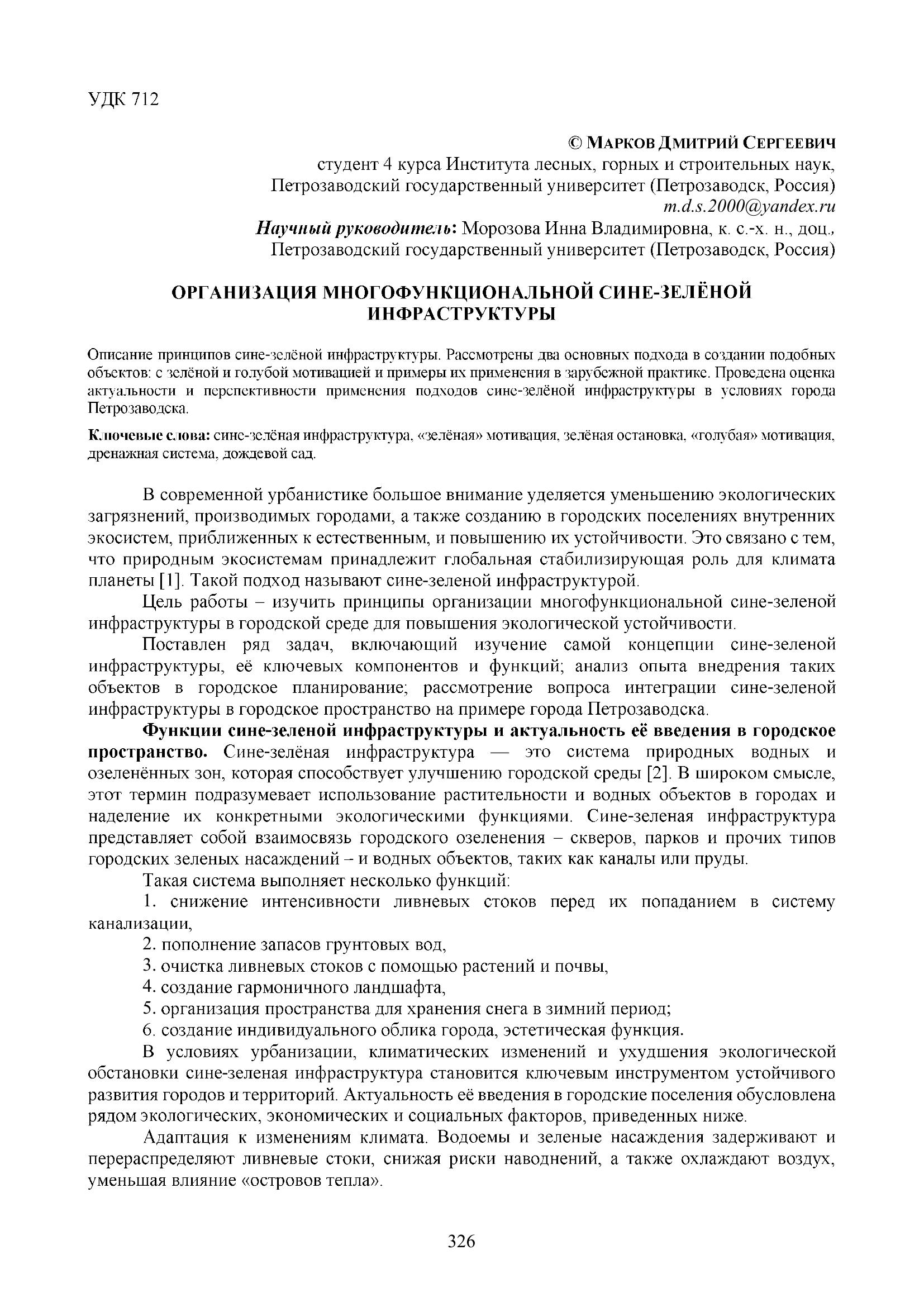 Описание принципов сине-зеленой инфраструктуры. Рассмотрены два основных подхода в создании подобных объектов: с зеленой и голубой мотивацией и примеры их применения в зарубежной практике. Проведена оценка актуальности и перспективности применения подходов сине-зеленой инфраструктуры в условиях города Петрозаводска.