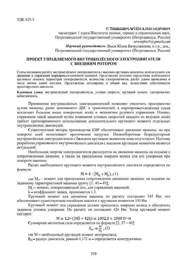 Тишкевич А. А. Проект управляемого внутриколесного электродвигателя с внешним ротором / А. А. Тишкевич. — Текст : электронный // Научно-исследовательская работа обучающихся и молодых учёных: материалы 77-й Всероссийской (с международным участием) научной конференции обучающихся и молодых учёных, посвящённой 85-летию ПетрГУ и 80-летию Победы в Великой Отечественной войне (г. Петрозаводск, 31 марта – 27 апреля 2025 года). — Петрозаводск : Изд-во ПетрГУ, 2025. — С. 359-362. — URL: http://elibrary.petrsu.ru/books/80185 (дата обращения: 05.12.2025)