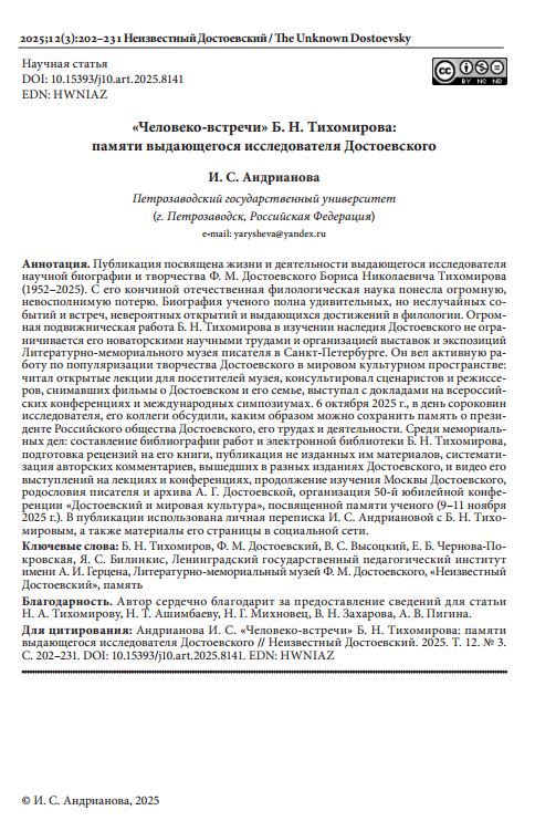 Публикация посвящена жизни и деятельности выдающегося исследователя научной биографии и творчества Ф. М. Достоевского Бориса Николаевича Тихомирова (1952–2025). В публикации использована личная переписка И. С. Андриановой с Б. Н. Тихомировым, а также материалы его страницы в социальной сети.