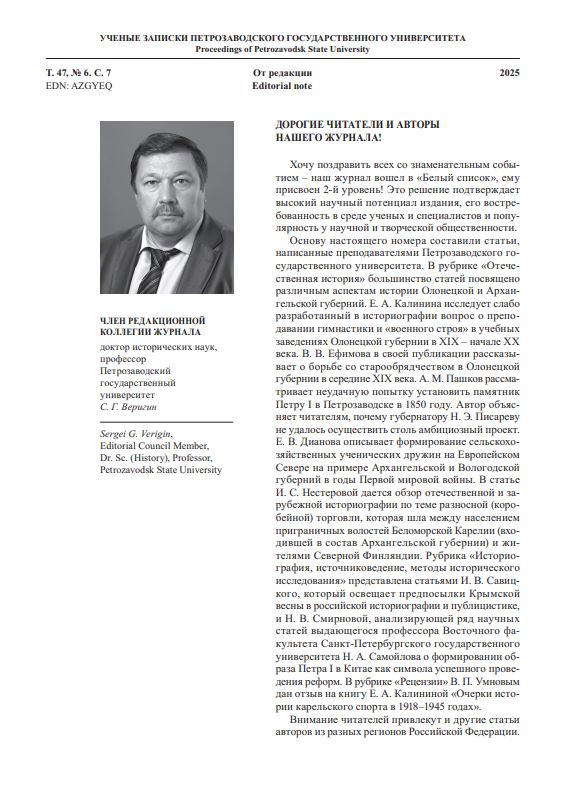 Основу настоящего номера составили статьи, написанные преподавателями Петрозаводского государственного университета. В рубрике «Отечественная история» большинство статей посвящено различным аспектам истории Олонецкой и Архангельской губерний. Внимание читателей привлекут и другие статьи авторов из разных регионов Российской Федерации.