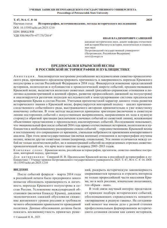 Анализируется построение российскими исследователями сюжетно-хронологического ряда, призванного продемонстрировать причинность и завершенность перехода Крымского полуострова в состав Российской Федерации в 2014 году. Фиксируется изменение представлений историков, политологов и публицистов о хронологической широте событий, предшествовавших Крымской весне, выделяется несколько сюжетных линий (российско-украинские отношения в политико-административной и военной сферах, развитие пророссийских движений на полуострове) и анализируются различия подходов исследователей к конструированию системы предпосылок возвращения Крыма в состав России. Учитывая презентистский характер данного этапа развития исторического знания о Крымской весне, формулируется векторный подход – анализ причинноследственного событийного ряда, выстраиваемого авторами применительно к уже известному конечному событию.