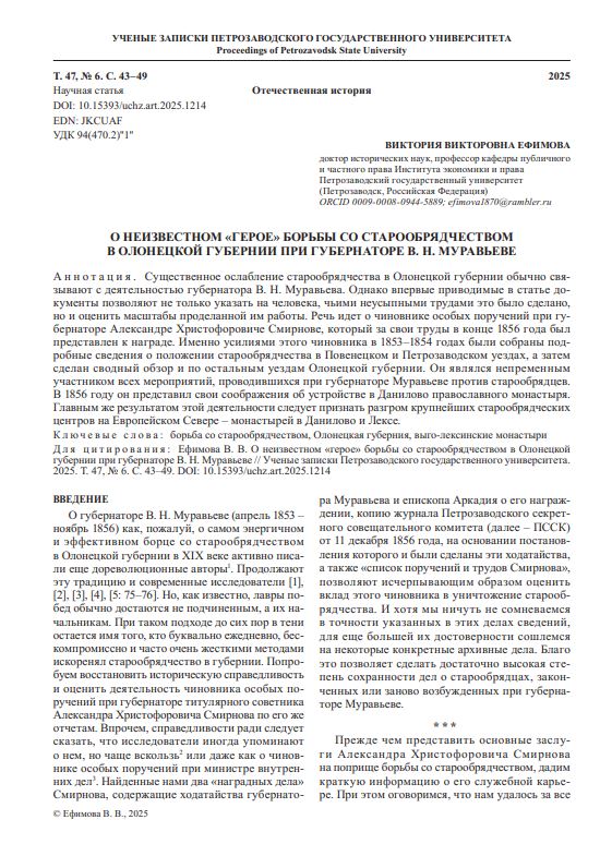 О неизвестном «герое» борьбы со старообрядчеством в Олонецкой губернии при губернаторе В. Н. МуравьевеКалинина Елена Александровна