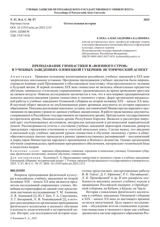 Преподавание гимнастики и «военного строя» в учебных заведениях Олонецкой губернии: исторический аспектПашков Александр Михайлович