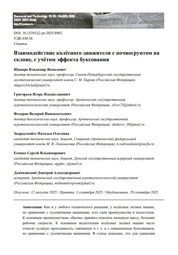 Взаимодействие колёсного движителя с почвогрунтом на склоне, с учётом эффекта буксованияМохирев Александр Петрович, Исламова Мэри Темуровна, Бурмистрова Ольга Николаевна, Кручинин Игорь Николаевич, Отев Кирилл Сергеевич