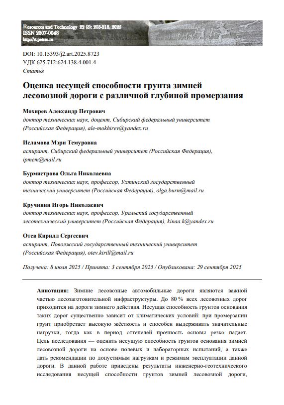 Зимние лесовозные автомобильные дороги являются важной частью лесозаготовительной инфраструктуры. До 80 % всех лесовозных дорог приходится на дороги зимнего действия. Несущая способность грунтов основания таких дорог существенно зависит от климатических условий: при промерзании грунт приобретает высокую жёсткость и способен выдерживать значительные нагрузки, тогда как в период оттепелей прочность основы резко падает. Цель исследования — оценить несущую способность грунтов основания зимней лесовозной дороги на основе полевых и лабораторных испытаний, а также дать рекомендации по допустимым нагрузкам и режимам эксплуатации данной дороги...