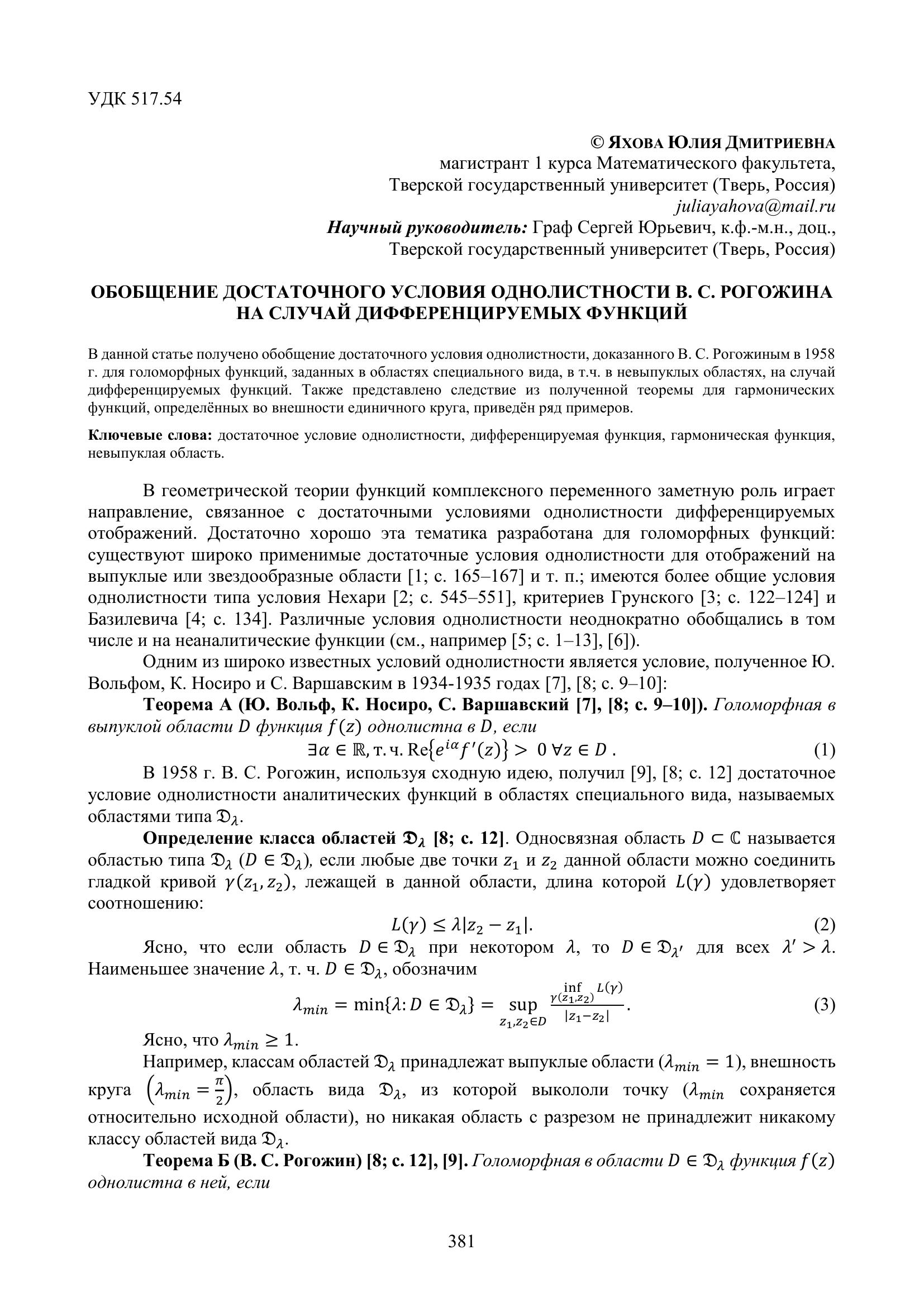 Яхова Ю. Д. Обобщение достаточного условия однолистности В. С. Рогожина на случай дифференцируемых функций / Ю. Д. Яхова. — Текст : электронный // Научно-исследовательская работа обучающихся и молодых учёных: материалы 77-й Всероссийской (с международным участием) научной конференции обучающихся и молодых учёных, посвящённой 85-летию ПетрГУ и 80-летию Победы в Великой Отечественной войне (г. Петрозаводск, 31 марта – 27 апреля 2025 года). — Петрозаводск : Изд-во ПетрГУ, 2025. — С. 381-385. — URL: http://elibrary.petrsu.ru/books/80348 (дата обращения: 05.12.2025)