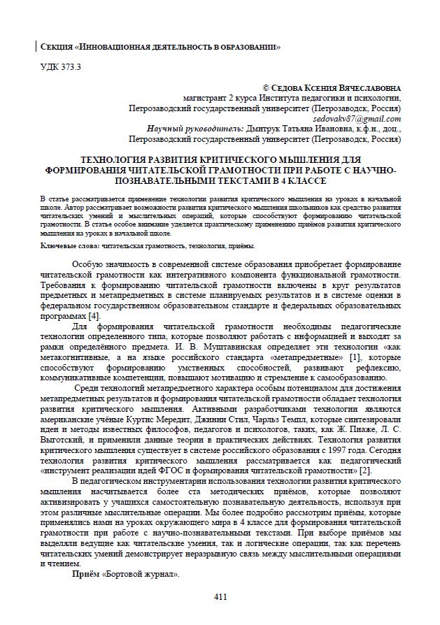 Технология развития критического мышления для формирования читательской грамотности при работе с научно-познавательными текстами в 4 классе