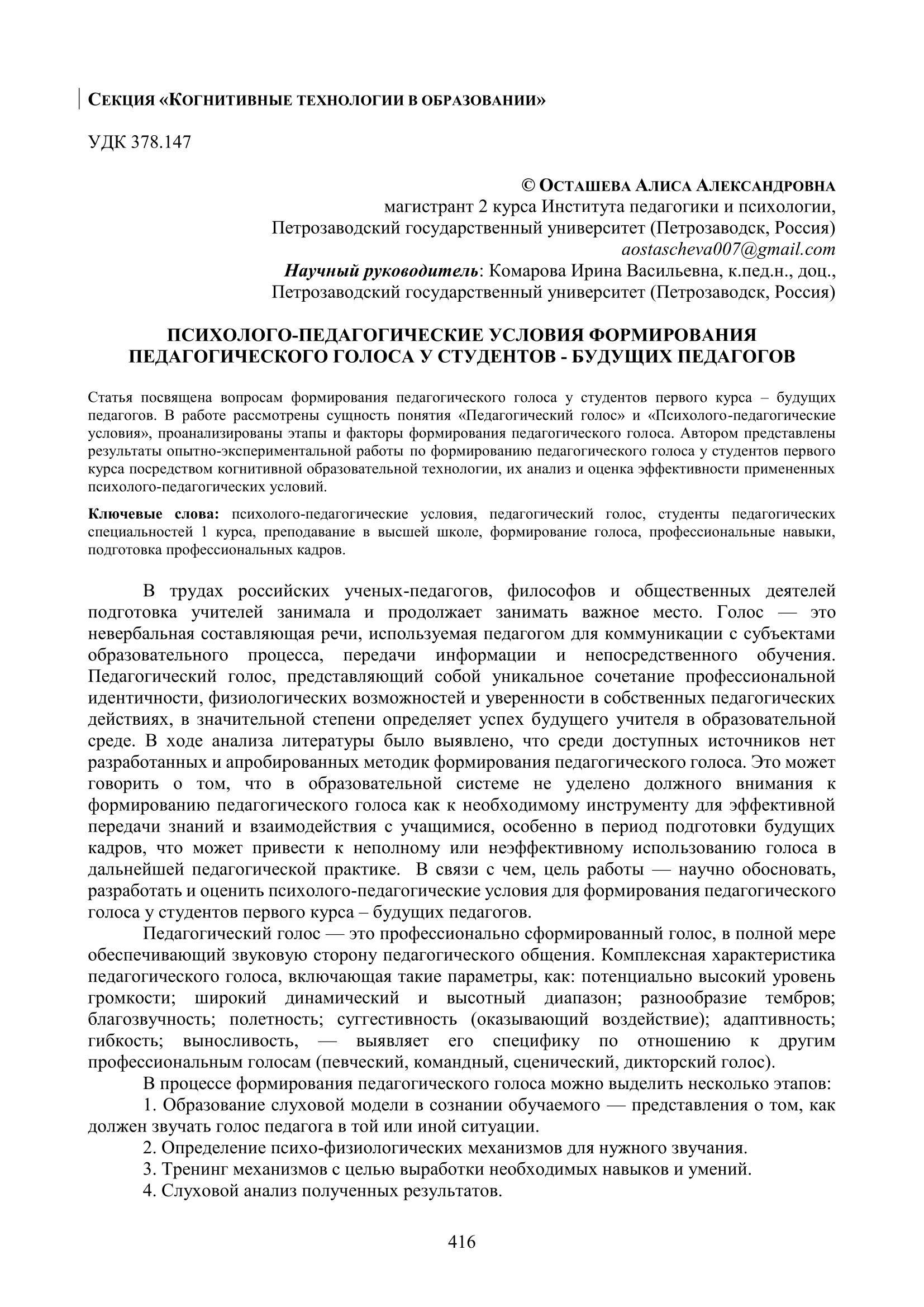Статья посвящена вопросам формирования педагогического голоса у студентов первого курса – будущих педагогов. В работе рассмотрены сущность понятия «Педагогический голос» и «Психолого-педагогические условия», проанализированы этапы и факторы формирования педагогического голоса. Автором представлены результаты опытно-экспериментальной работы по формированию педагогического голоса у студентов первого курса посредством когнитивной образовательной технологии, их анализ и оценка эффективности примененных психолого-педагогических условий.