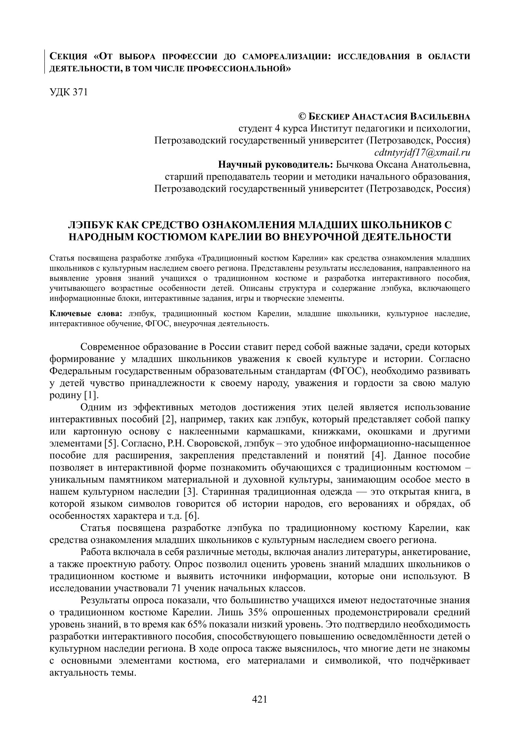 Статья посвящена разработке лэпбука «Традиционный костюм Карелии» как средство ознакомления младших школьников с культурным наследием своего региона. Представлены результаты исследования, направленного на выявление уровня знаний учащихся о традиционном костюме и разработка интерактивного пособия, учитывающего возрастные особенности детей. Описаны структура и содержание лэпбука, включающего информационные блоки, интерактивные задания, игры и творческие элементы.