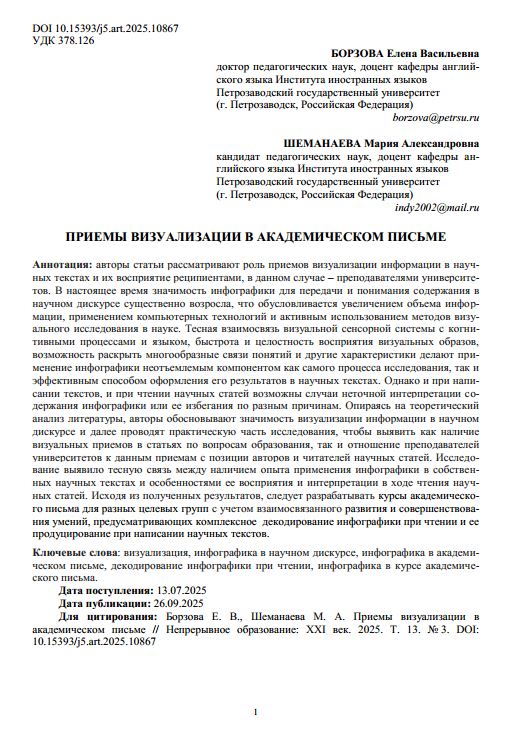 Авторы статьи рассматривают роль приемов визуализации информации в научных текстах и их восприятие реципиентами, в данном случае – преподавателями университетов.