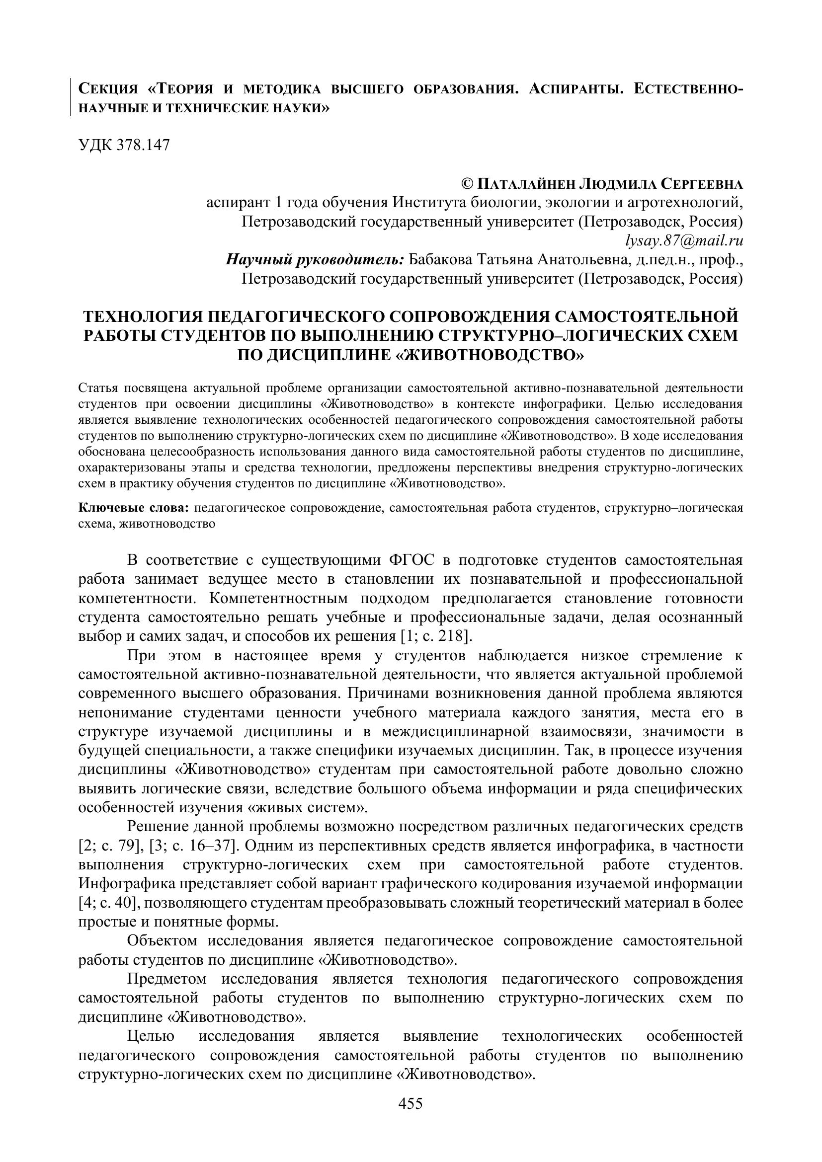 Статья посвящена актуальной проблеме организации самостоятельной активно-познавательной деятельности студентов при освоении дисциплины «Животноводство» в контексте инфографики. Целью исследования является выявление технологических особенностей педагогического сопровождения самостоятельной работы студентов по выполнению структурно-логических схем по дисциплине «Животноводство». В ходе исследования обоснована целесообразность использования данного вида самостоятельной работы студентов по дисциплине, охарактеризованы этапы и средства технологии, предложены перспективы внедрения структурно-логических схем в практику обучения студентов по дисциплине «Животноводство».