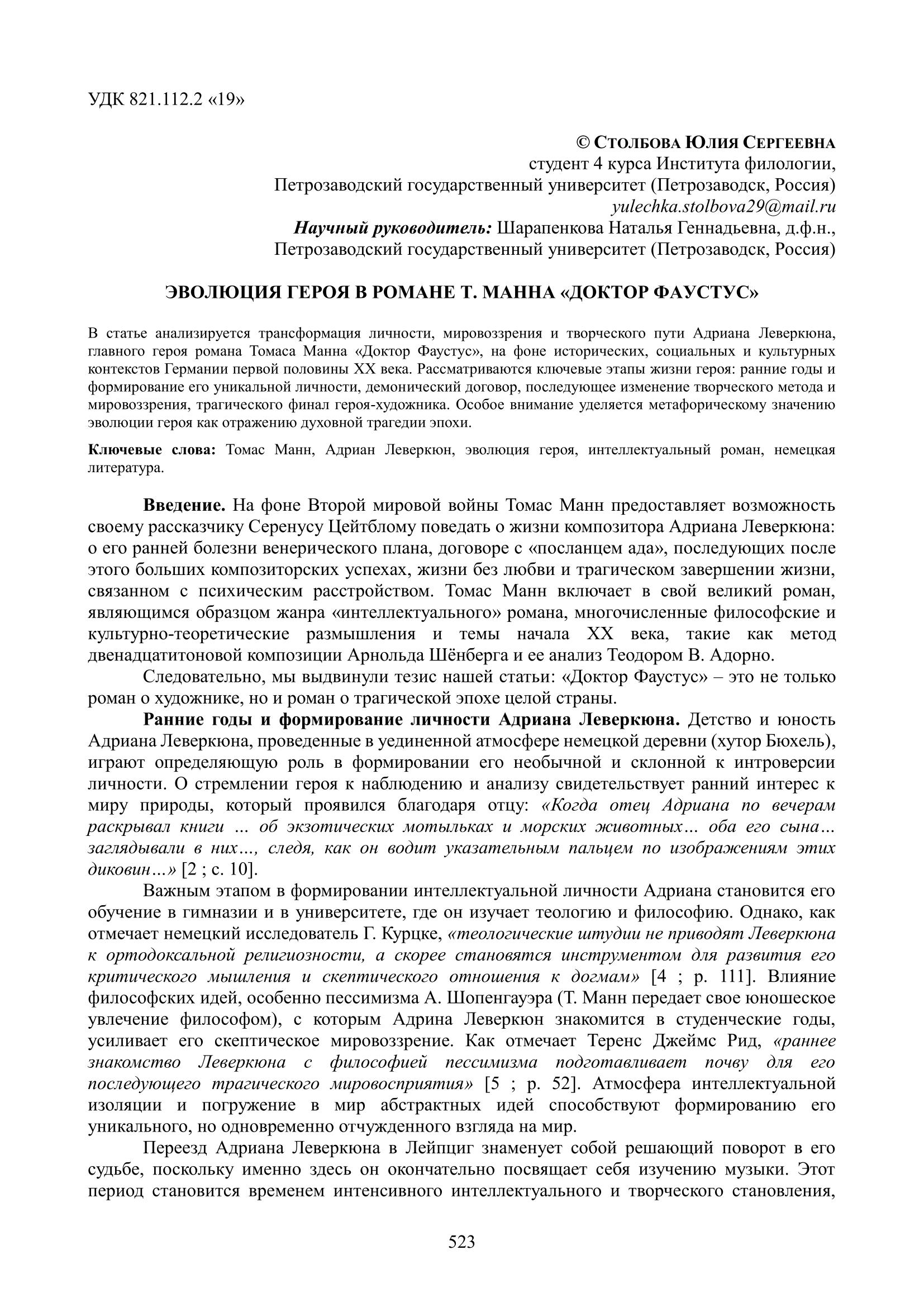 В статье анализируется трансформация личности, мировоззрения и творческого пути Адриана Леверкюна, главного героя романа Томаса Манна «Доктор Фаустус», на фоне исторических, социальных и культурных контекстов Германии первой половины ХХ века. Рассматриваются ключевые этапы жизни героя: ранние годы и формирование его уникальной личности, демонический договор, последующее изменение творческого метода и мировоззрения, трагического финала героя-художника. Особое внимание уделяется метафорическому значению эволюции героя как отражению духовной трагедии эпохи.