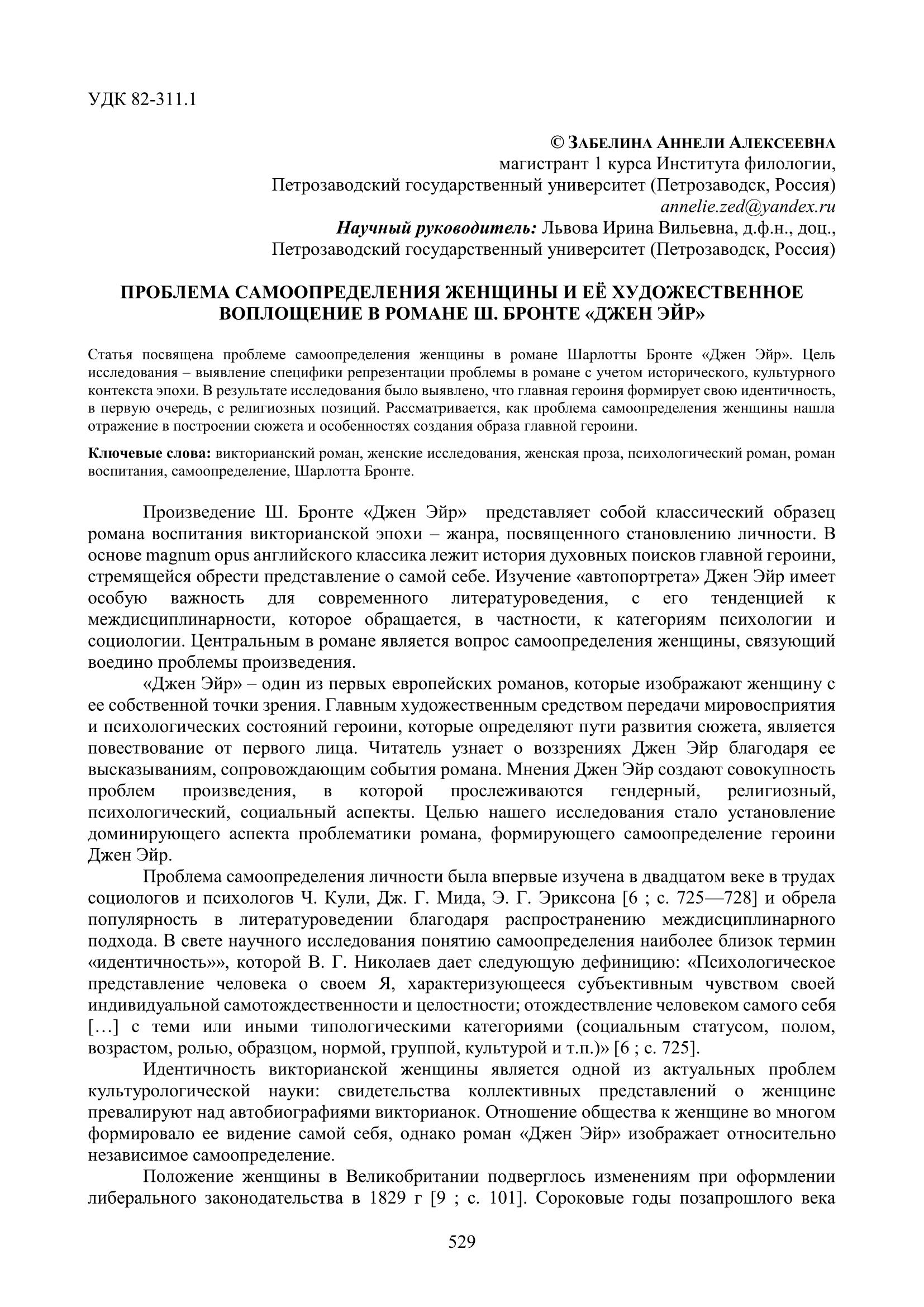 Статья посвящена проблеме самоопределения женщины в романе Шарлотты Бронте «Джен Эйр». Цель исследования – выявление специфики репрезентации проблемы в романе с учетом исторического, культурного контекста эпохи. В результате исследования было выявлено, что главная героиня формирует свою идентичность, в первую очередь, с религиозных позиций. Рассматривается, как проблема самоопределения женщины нашла отражение в построении сюжета и особенностях создания образа главной героини.