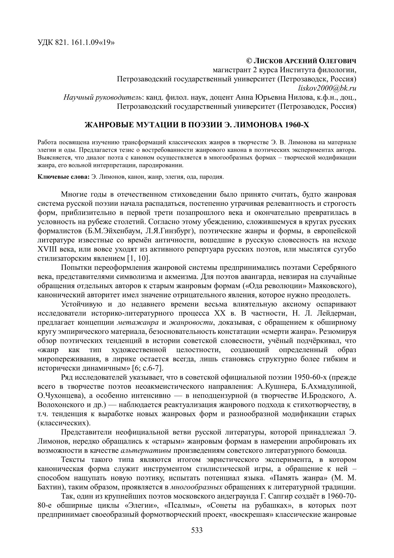 Лисков А. О. Жанровые мутации в поэзии Э. Лимонова 1960-х / А. О. Лисков. — Текст : электронный // Научно-исследовательская работа обучающихся и молодых учёных: материалы 77-й Всероссийской (с международным участием) научной конференции обучающихся и молодых учёных, посвящённой 85-летию ПетрГУ и 80-летию Победы в Великой Отечественной войне (г. Петрозаводск, 31 марта – 27 апреля 2025 года). — Петрозаводск : Изд-во ПетрГУ, 2025. — С. 533-536. — URL: http://elibrary.petrsu.ru/books/80624 (дата обращения: 05.12.2025)