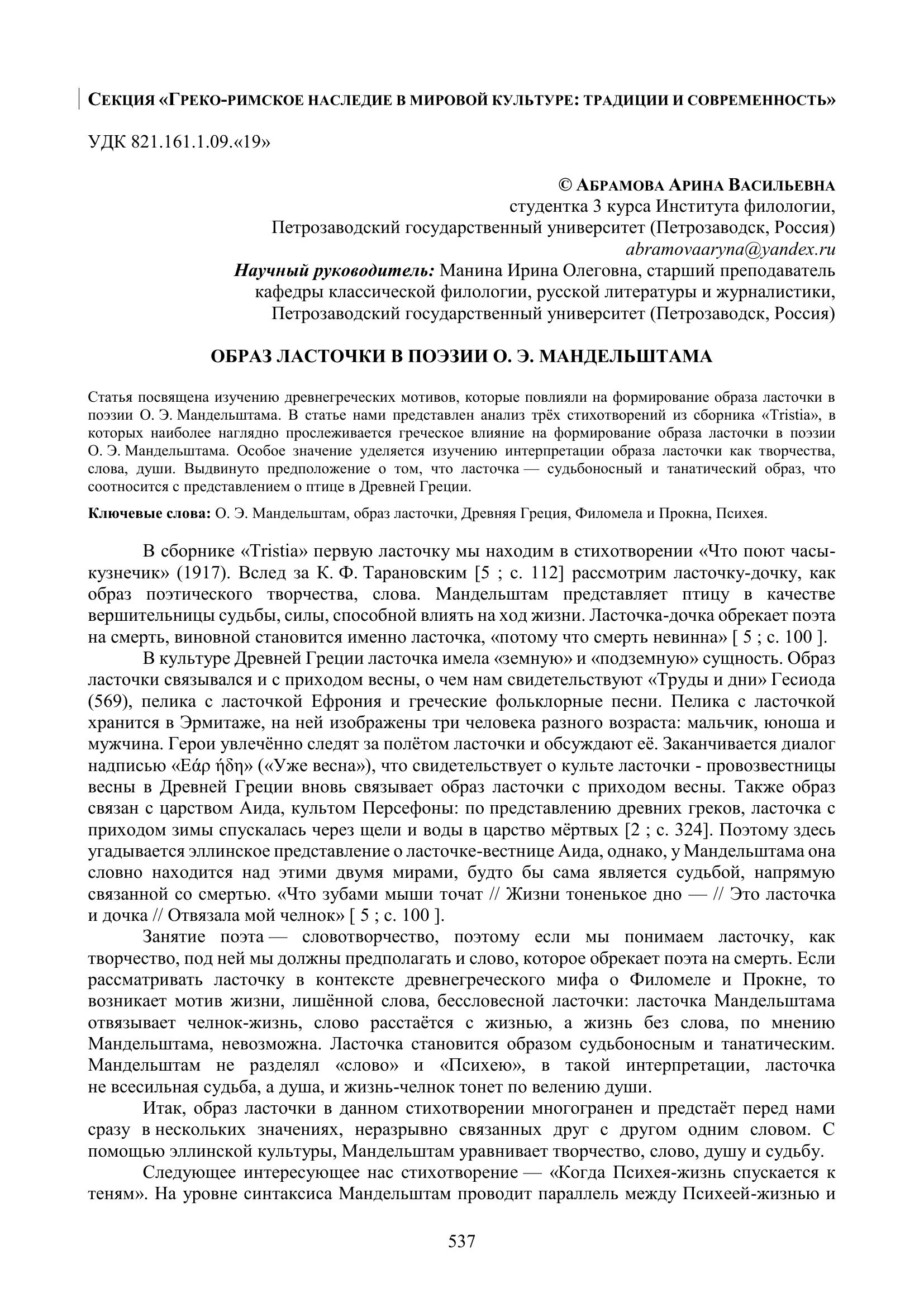 Статья посвящена изучению древнегреческих мотивов, которые повлияли на формирование образа ласточки в поэзии О. Э. Мандельштама. В статье нами представлен анализ трех стихотворений из сборника «Tristia», в которых наиболее наглядно прослеживается греческое влияние на формирование образа ласточки в поэзии О. Э. Мандельштама. Особое значение уделяется изучению интерпретации образа ласточки как творчества, слова, души. Выдвинуто предположение о том, что ласточка – судьбоносный и танатический образ, что соотносится с представлением о птице в Древней Греции.