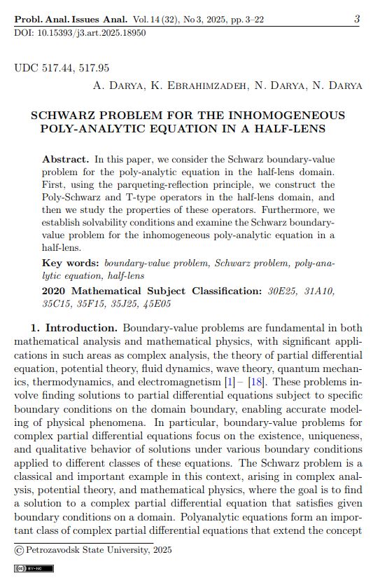 В этой статье рассматривается краевая задача Schwarz для полианалитического уравнения в области полуобъективов. Сначала, используя принцип зеркального отражения, выстраиваются операторы Poly-Schwarz и T-типа в области полуобъективов, а затем изучаются свойства этих операторов. Кроме того, устанавливаются условия разрешимости и исследуется краевая задача Schwarz для неоднородного полианалитического уравнения в полуобъективе.