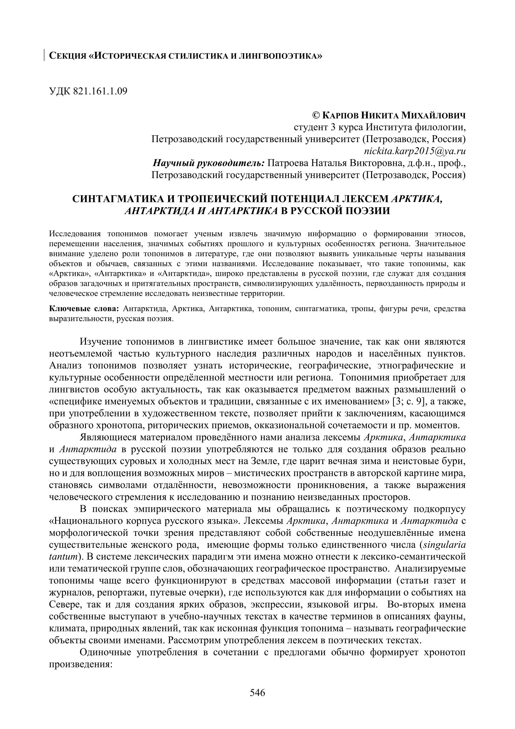 Синтагматика и тропеический потенциал лексем Арктика, Антарктида и Антарктика в русской поэзии
